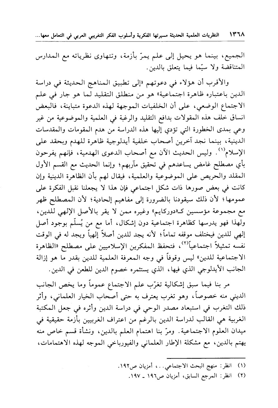والأقرب أن هؤلاء في دعوتهم "إلى تطبيق المناهج الحديثة في دراسة الدين باعتباره ظاهرة اجتماعية" هو من منطلق التقليد لما هو جار في علم الاجتماع الوضعي، على أن الخلفيات الموجهة لهذه الدعوة متباينة، فالبعض انساق خلف هذه المقولات بدائع التقليد والرغبة في العلمية والموضوعية من غير وعي بمدى الخطورة التي تؤدي إليها هذه الدراسة من هدم المقومات والمقدسات الدينية، بينما نجد آخرين أصحاب خلفية أيدلوجية ظاهرة للهدم وبحقد على الإِسلام (¬1). وليس الحديث الآن مع أصحاب الدعوى الهدمية، فإنهم يفرحون بأي مصطلح غامض يساعدهم في تحقيق مآربهم؛ وإنما الحديث مع القسم الأول المقلد والحريص على الموضوعية والعلمية، فيقال لهم بأن الظاهرة الدينية وإن كانت في بعض صورها ذات شكل اجتماعي فإن هذا لا يجعلنا نقبل الفكرة على عمومها؛ لأن ذلك سيقودنا بالضرورة إلى مفاهيم إلحادية؛ لأن المصطلح ظهر مع مجموعة مؤسسين كـ"دوركايم" وغيره ممن لا يقر بالأصل الإلهي للدين، ولهذا فهو يدرسها كظاهرة اجتماعية دون إشكال، أما مع من يُسلّم بوجود أصل إلهي للدين فيختلف موقفه تمامًا؛ لأنه يجد للدين أصلًا إلهيًا ويجد له في الوقت نفسه تمثيلًا اجتماعيًا (¬2)، فتحفظ المفكرين الإِسلاميين على مصطلح "الظاهرة الاجتماعية للدين" ليس وقوفًا في وجه المعرفة العلمية للدين بقدر ما هو إزالة الجانب الأيدلوجي الذي فيها، الذي يستثمره خصوم الدين للطعن في الدين.