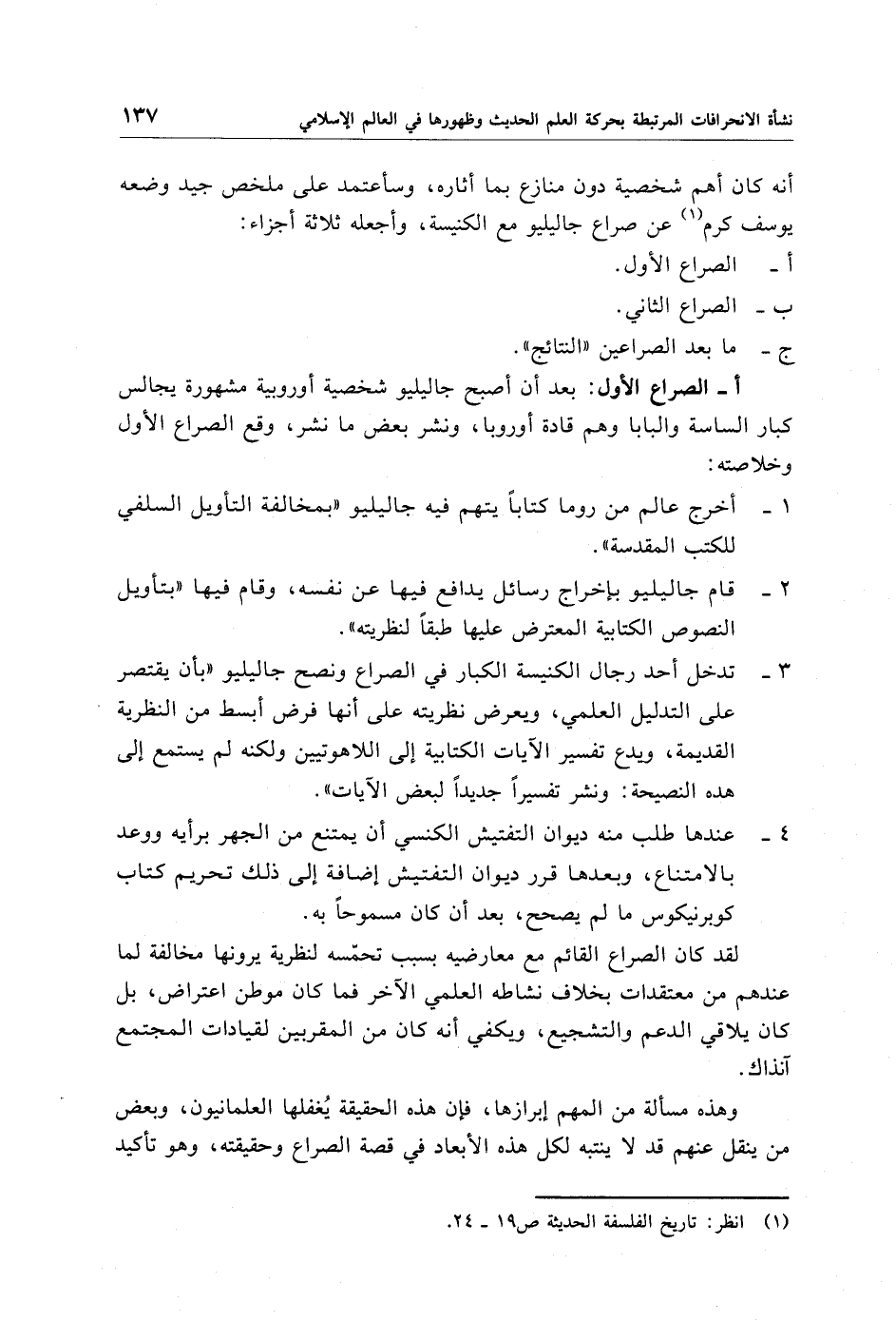 أنه كان أهم شخصية دون منازع بما أثاره، وسأعتمد على ملخص جيد وضعه يوسف كرم (¬1) عن صراع جاليليو مع الكنيسة، وأجعله ثلاثة أجزاء: