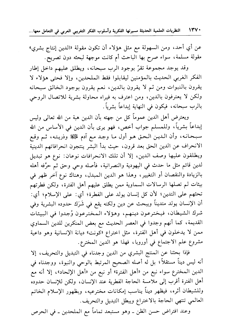 عن أي أحد، ومن السهولة مع مثل هؤلاء أن تكون مقولة "الدين إنتاج بشري" مقولة مسلمة، سواء صرح بها الباحث أم كانت موجهة لبحثه دون تصريح.