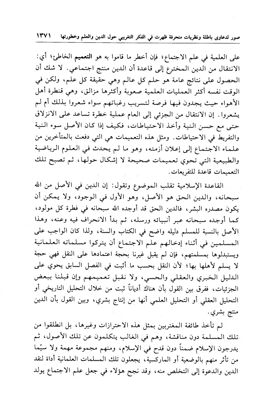 على العلمية في علم الاجتماع؛ فإن أخطر ما قاموا به هو التعميم الخاطئ؛ أي: الانتقال من الدين المخترع إلى قاعدة أن الدين منتج اجتماعي. لا شك أن الحصول على نتائج عامة هو حلم كل عالم وهي حقيقة كل علم، ولكن في الوقت نفسه أكثر العمليات العلمية صعوبة وأكثرها مزالق، وهي قنطرة أهل الأهواء حيث يجدون فيها فرصة لتسريب رغباتهم سواء شعروا بذلك أم لم يشعروا. إن الانتقال من الجزئي إلى العام عملية خطرة تساعد على الانزلاق حتى مع حسن النية وأخذ الاحتياطات، فكيف إذا كان الأصل سوء النية والتفريط في الاحتياطات. ومثل هذه التعميمات هي التي دفعت بالمتأخرين من علماء الاجتماع إلى إعلان أزمته، وهو ما لم يحدث في العلوم الرياضية والطبيعية التي تحوي تعميمات صحيحة لا إشكال حولها، ثم تصبح تلك التعميمات قاعدة للتفريعات.