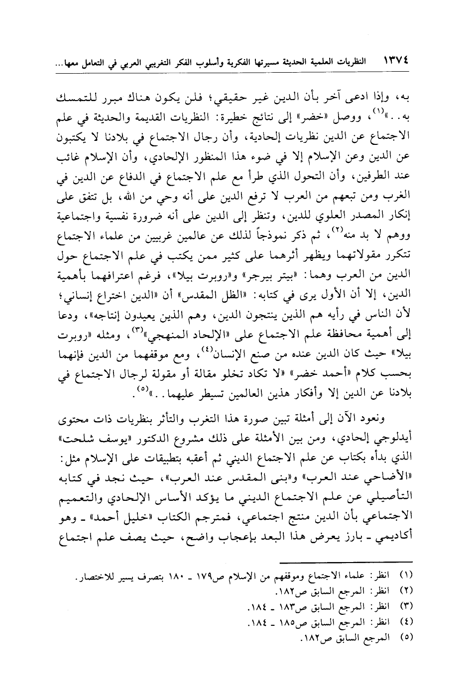 به، وإذا ادعى آخر بأن الدين غير حقيقي؛ فلن يكون هناك مبرر للتمسك به. ." (¬1)، ووصل "خضر" إلى نتائج خطيرة: النظريات القديمة والحديثة في علم الاجتماع عن الدين نظريات إلحادية، وأن رجال الاجتماع في بلادنا لا يكتبون عن الدين وعن الإسلام إلا في ضوء هذا المنظور الإلحادي، وأن الإسلام غائب عند الطرفين، وأن التحول الذي طرأ مع علم الاجتماع في الدفاع عن الدين في الغرب ومن تبعهم من العرب لا ترفع الدين على أنه وحي من الله، بل تتفق على إنكار المصدر العلوي للدين، وتنظر إلى الدين على أنه ضرورة نفسية واجتماعية ووهم لابد منه (¬2)، ثم ذكر نموذجًا لذلك عن عالمين غربيين من علماء الاجتماع تتكرر مقولاتهما ويظهر أثرهما على كثير ممن يكتب في علم الاجتماع حول الدين من العرب وهما: "بيتر بيرجر" و"روبرت بيلا"، فرغم اعترافهما بأهمية الدين، إلا أن الأول يرى في كتابه: "الظل المقدس" أن "الدين اختراع إنساني؛ لأن الناس في رأيه هم الذين ينتجون الدين، وهم الذين يعيدون إنتاجه"، ودعا إلى أهمية محافظة علم الاجتماع على "الإلحاد المنهجي" (¬3)، ومثله "روبرت بيلا" حيث كان الدين عنده من صنع الإنسان (¬4)، ومع موقفهما من الدين فإنهما بحسب كلام "أحمد خضر" "لا تكاد تخلو مقالة أو مقولة لرجال الاجتماع في بلادنا عن الدين إلا وأفكار هذين العالمين تسيطر عليهما. ." (¬5).