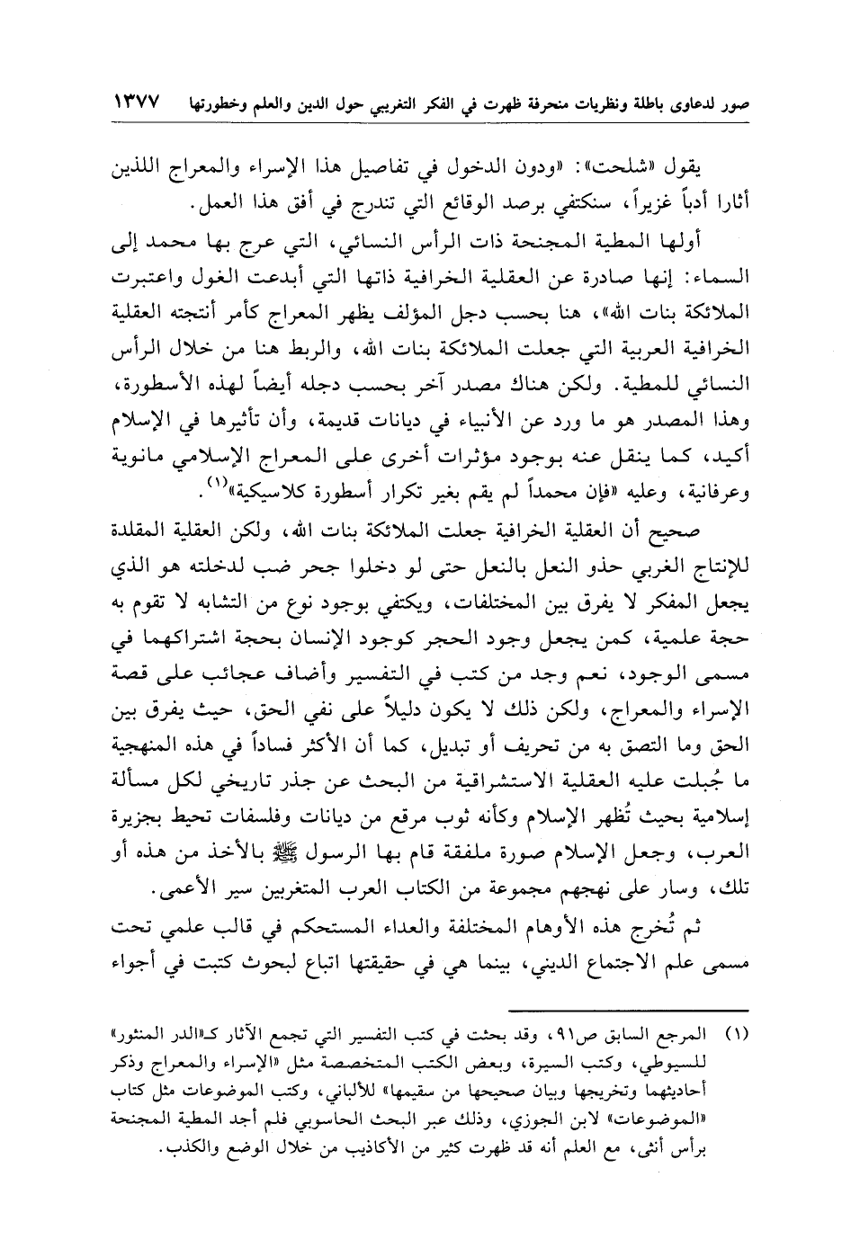 صحيح أن العقلية الخرافية جعلت الملائكة بنات الله، ولكن العقلية المقلدة للإنتاج الغربي حذو النعل بالنعل حتى لو دخلوا جحر ضب لدخلته هو الذي يجعل المفكر لا يفرق بين المختلفات، ويكتفي بوجود نوع من التشابه لا تقوم به حجة علمية، كمن يجعل وجود الحجر كوجود الإنسان بحجة اشتراكهما في مسمى الوجود، نعم وجد من كتب في التفسير وأضاف عجائب على قصة الإسراء والمعراج، ولكن ذلك لا يكون دليلًا على نفي الحق، حيث يفرق بين الحق وما التصق به من تحريف أو تبديل، كما أن الأكثر فسادًا في هذه المنهجية ما جُبلت عليه العقلية الاستشراقية من البحث عن جذر تاريخي لكل مسألة إسلامية بحيث تُظهر الإسلام وكأنه ثوب مرقع من ديانات وفلسفات تحيط بجزيرة العرب، وجعل الإسلام صورة ملفقة قام بها الرسول - صلى الله عليه وسلم - بالأخذ من هذه أو تلك، وسار على نهجهم مجموعة من الكتاب العرب المتغربين سير الأعمى.