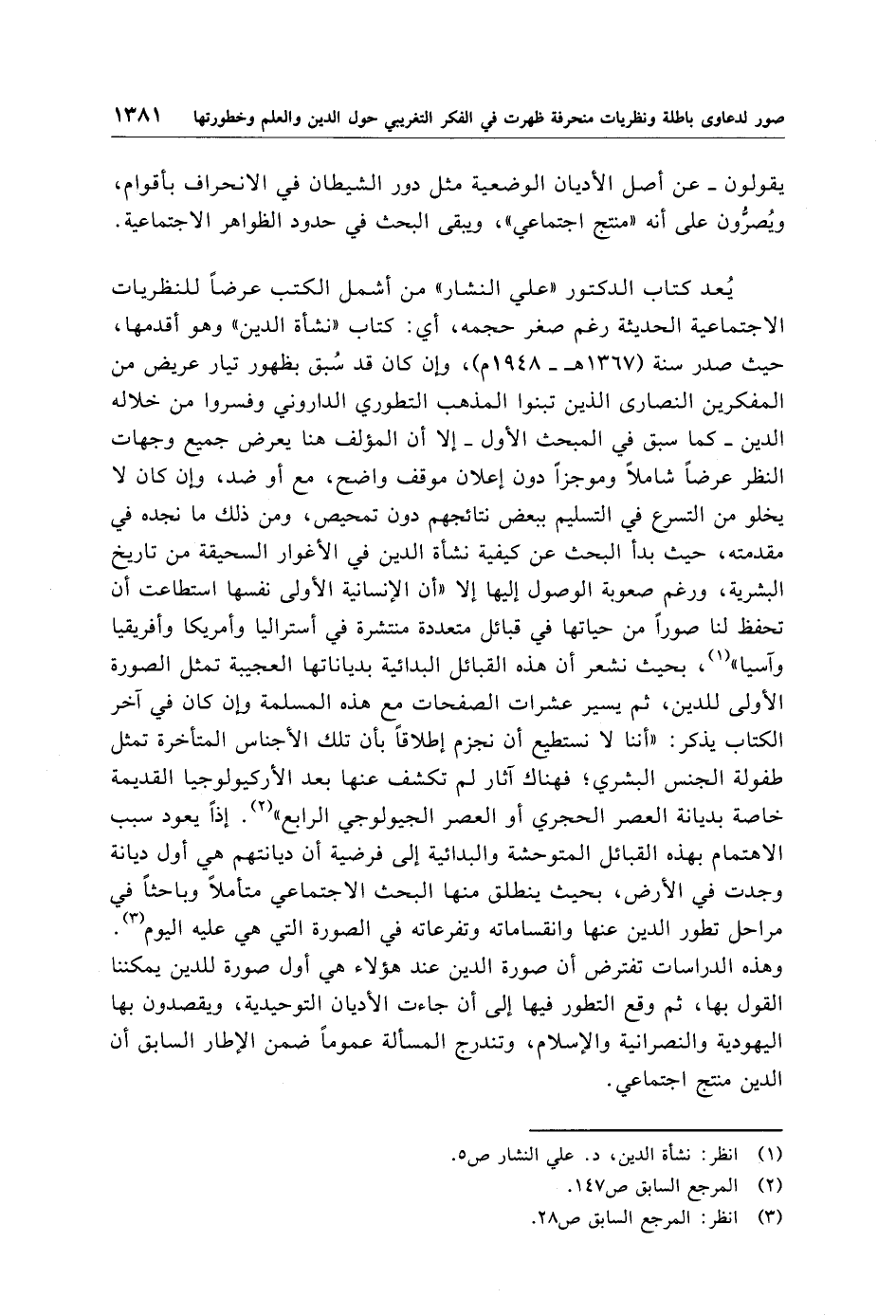 يُعد كتاب الدكتور "علي النشار" من أشمل الكتب عرضًا للنظريات الاجتماعية الحديثة رغم صغر حجمه، أي: كتاب "نشأة الدين" وهو أقدمها، حيث صدر سنة (1367 هـ -1948 م)، وإن كان قد سُبق بظهور تيار عريض من المفكرين النصارى الذين تبنوا المذهب التطوري الداروني وفسروا من خلاله الدين -كما سبق في المبحث الأول- إلا أن المؤلف هنا يعرض جميع وجهات النظر عرضًا شاملًا وموجزًا دون إعلان موقف واضح، مع أو ضد، وإن كان لا يخلو من التسرع في التسليم ببعض نتائجهم دون تمحيص، ومن ذلك ما نجده في مقدمته، حيث بدأ البحث عن كيفية نشأة الدين في الأغوار السحيقة من تاريخ البشرية، ورغم صعوبة الوصول إليها إلا "أن الإنسانية الأولى نفسها استطاعت أن تحفظ لنا صورًا من حياتها في قبائل متعددة منتشرة في أستراليا وأمريكا وأفريقيا وآسيا" (¬1)، بحيث نشعر أن هذه القبائل البدائية بدياناتها العجيبة تمثل الصورة الأولى للدين، ثم يسير عشرات الصفحات مع هذه المسلمة وإن كان في آخر الكتاب يذكر: "أننا لا نستطيع أن نجزم إطلاقًا بأن تلك الأجناس المتأخرة تمثل طفولة الجنس البشري؛ فهناك آثار لم تكشف عنها بعد الأركيولوجيا القديمة خاصة بديانة العصر الحجري أو العصر الجيولوجي الرابع" (¬2). إذًا يعود سبب الاهتمام بهذه القبائل المتوحشة والبدائية إلى فرضية أن ديانتهم هي أول ديانة وجدت في الأرض، بحيث ينطلق منها البحث الاجتماعي متأملًا وباحثًا في مراحل تطور الدين عنها وانقساماته وتفرعاته في الصورة التي هي عليه اليوم (¬3). وهذه الدراسات تفترض أن صورة الدين عند هؤلاء هي أول صورة للدين يمكننا القول بها، ثم وقع التطور فيها إلى أن جاءت الأديان التوحيدية، ويقصدون بها اليهودية والنصرانية والإِسلام، وتندرج المسألة عمومًا ضمن الإطار السابق أن الدين منتج اجتماعي.