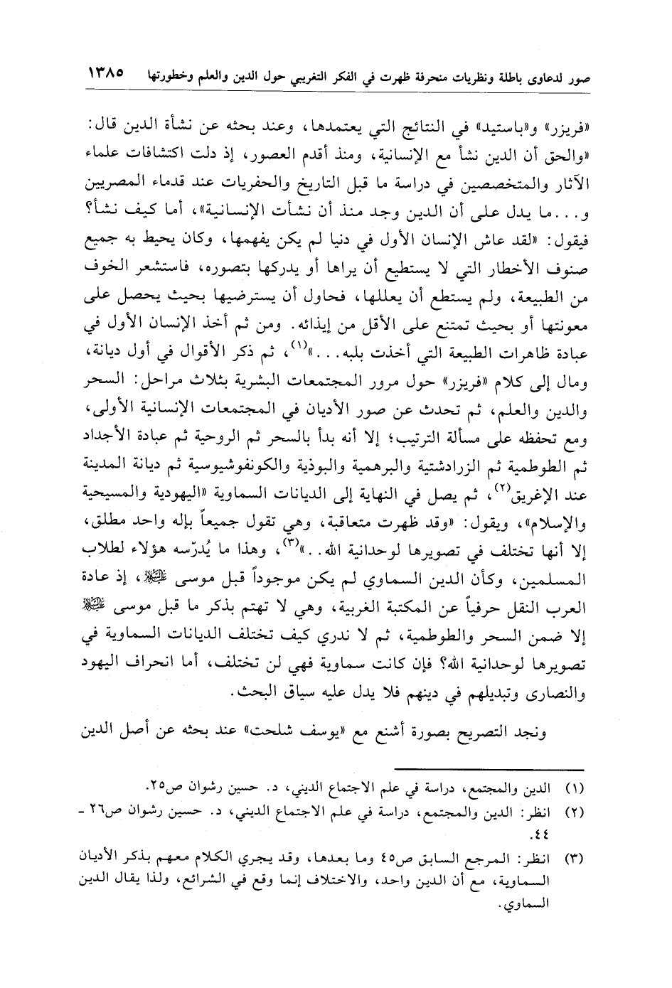 "فريزر" و"باستيد" في النتائج التي يعتمدها، وعند بحثه عن نشأة الدين قال: "والحق أن الدين نشأ مع الإنسانية، ومنذ أقدم العصور، إذ دلت اكتشافات علماء الآثار والمتخصصين في دراسة ما قبل التاريخ والحفريات عند قدماء المصريين و. . . . ما يدل على أن الدين وجد منذ أن نشأت الإنسانية", أما كيف نشأ؟ فيقول: "لقد عاش الإنسان الأول في دنيا لم يكن يفهمها، وكان يحيط به جميع صنوف الأخطار التي لا يستطيع أن يراها أو يدركها بتصوره، فاستشعر الخوف من الطبيعة، ولم يستطع أن يعللها، فحاول أن يسترضيها بحيث يحصل على معونتها أو بحيث تمتنع على الأقل من إيذائه. ومن ثم أخذ الإنسان الأول في عبادة ظاهرات الطبيعة التي أخذت بلبه. . . ." (¬1)، ثم ذكر الأقوال في أول ديانة، ومال إلى كلام "فريزر" حول مرور المجتمعات البشرية بثلاث مراحل: السحر والدين والعلم، ثم تحدث عن صور الأديان في المجتمعات الإنسانية الأولى، ومع تحفظه على مسألة الترتيب؛ إلا أنه بدأ بالسحر ثم الروحية ثم عبادة الأجداد ثم الطوطمية ثم الزرادشتية والبرهمية والبوذية والكونفوشيوسية ثم ديانة المدينة عند الإغريق (¬2)، ثم يصل في النهاية إلى الديانات السماوية "اليهودية والمسيحية والإِسلام"، ويقول: "وقد ظهرت متعاقبة، وهي تقول جميعًا بإله واحد مطلق، إلا أنها تختلف في تصويرها لوحدانية الله. ." (¬3)، وهذا ما يُدرّسه هؤلاء لطلاب المسلمين، وكأن الدين السماوي لم يكن موجودًا قبل موسى -عليه السلام-، إذ عادة العرب النقل حرفيًا عن المكتبة الغربية، وهي لا تهتم بذكر ما قبل موسى -عليه السلام- إلا ضمن السحر والطوطمية، ثم لا ندري كيف تختلف الديانات السماوية في تصويرها لوحدانية الله؟ فإن كانت سماوية فهي لن تختلف، أما انحراف اليهود والنصارى وتبديلهم في دينهم فلا يدل عليه سياق البحث.