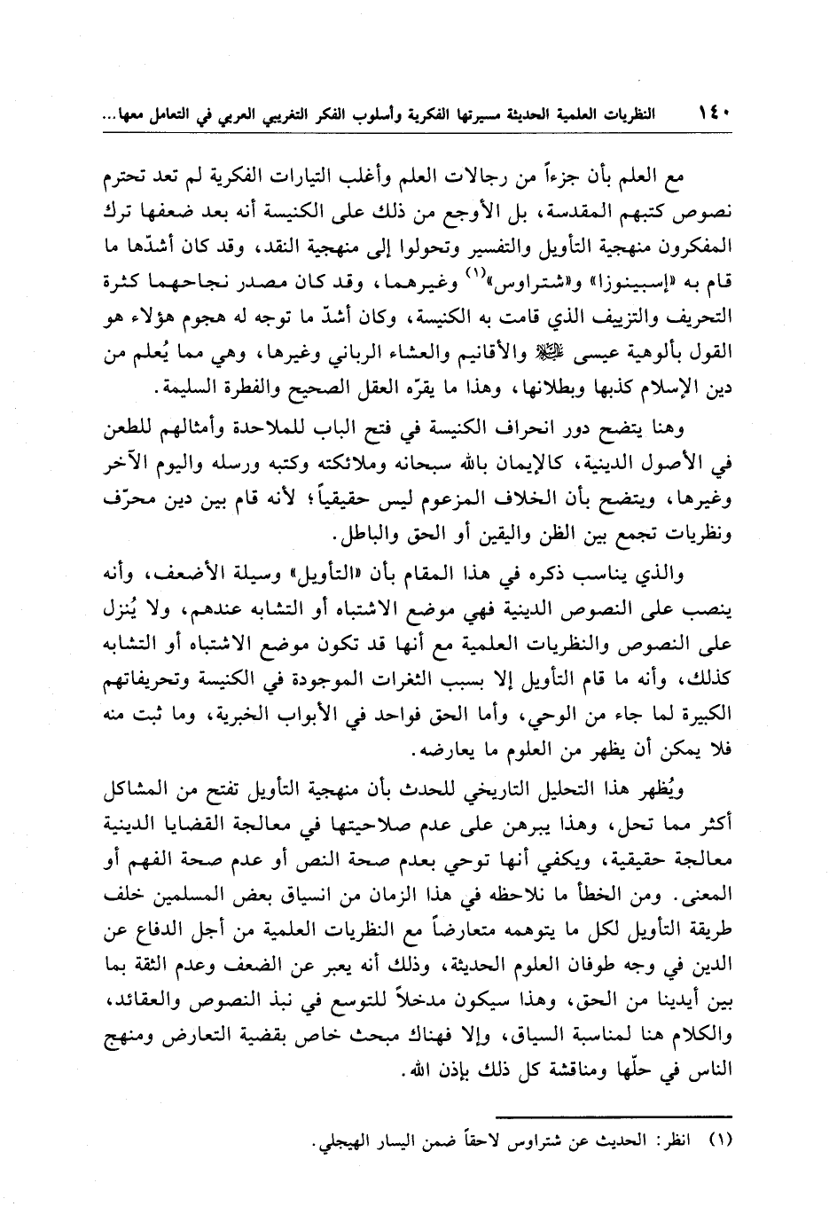 مع العلم بأن جزءًا من رجالات العلم وأغلب التيارات الفكرية لم تعد تحترم نصوص كتبهم المقدسة، بل الأوجع من ذلك على الكنيسة أنه بعد ضعفها ترك المفكرون منهجية التأويل والتفسير وتحولوا إلى منهجية النقد، وقد كان أشدّها ما قام به "إسبينوزا" و"شتراوس" (¬1) وغيرهما، وقد كان مصدر نجاحهما كثرة التحريف والتزييف الذي قامت به الكنيسة، وكان أشدّ ما توجه له هجوم هؤلاء هو القول بألوهية عيسى - عليه السلام - والأقانيم والعشاء الرباني وغيرها، وهي مما يُعلم من دين الإسلام كذبها وبطلانها، وهذا ما يقرّه العقل الصحيح والفطرة السليمة.