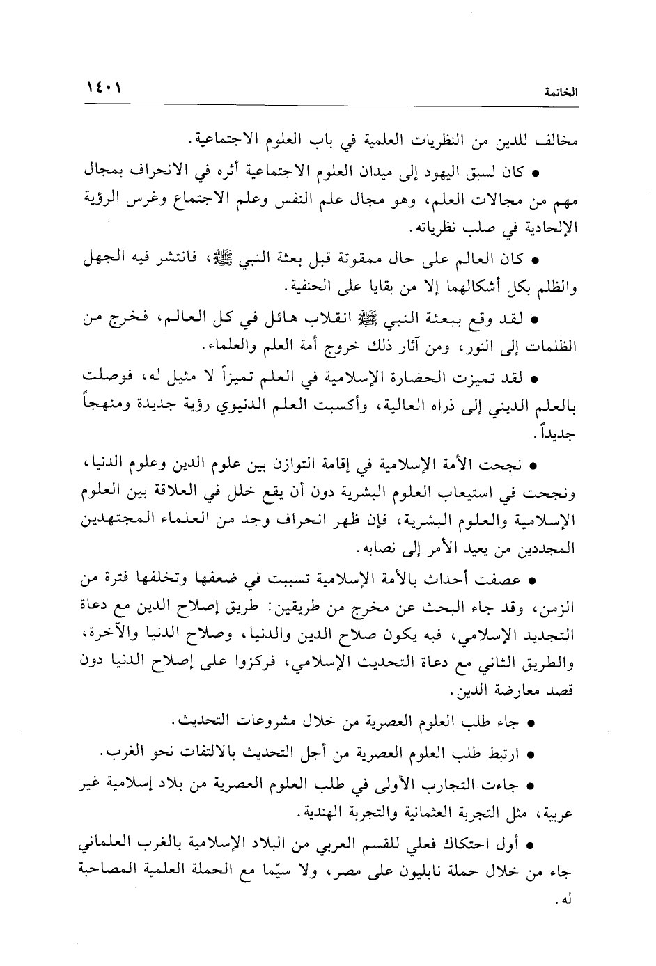 • نجحت الأمة الإِسلامية في إقامة التوازن بين علوم الدين وعلوم الدنيا، ونجحت في استيعاب العلوم البشرية دون أن يقع خلل في العلاقة بين العلوم الإِسلامية والعلوم البشرية، فإن ظهر انحراف وجد من العلماء المجتهدين المجددين من يعيد الأمر إلى نصابه.