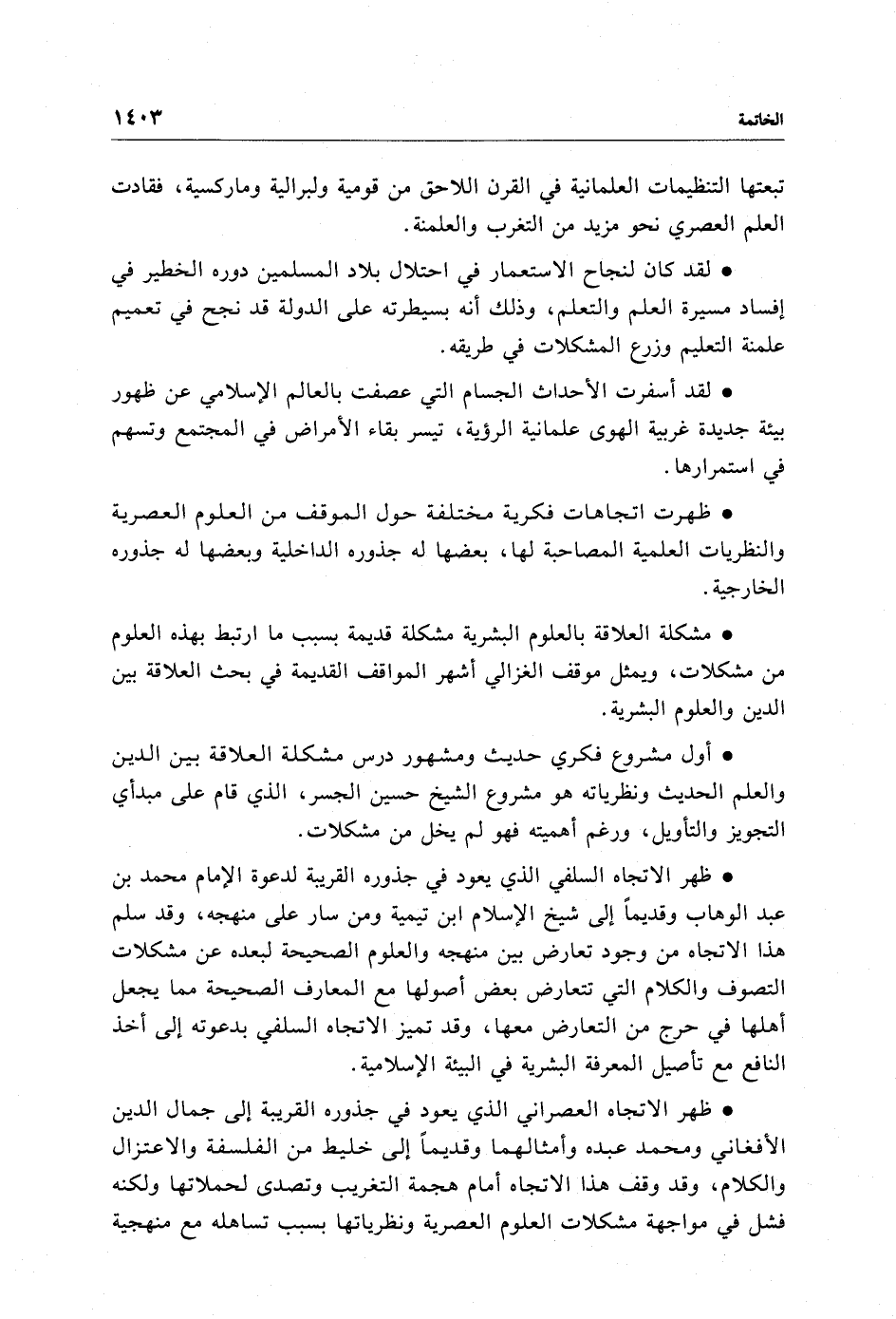 • ظهر الاتجاه السلفي الذي يعود في جذوره القريبة لدعوة الإِمام محمد بن عبد الوهاب وقديمًا إلى شيخ الإِسلام ابن تيمية ومن سار على منهجه، وقد سلم هذا الاتجاه من وجود تعارض بين منهجه والعلوم الصحيحة لبعده عن مشكلات التصوف والكلام التي تتعارض بعض أصولها مع المعارف الصحيحة مما يجعل أهلها في حرج من التعارض معها، وقد تميز الاتجاه السلفي بدعوته إلى أخذ النافع مع تأصيل المعرفة البشرية في البيئة الإِسلامية.