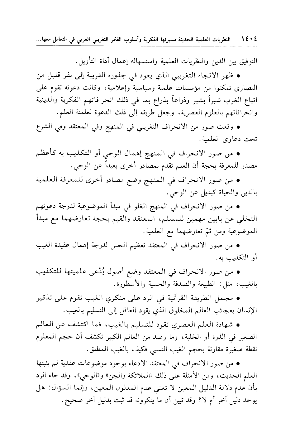 • من صور الانحراف في المعتقد الادعاء بوجود موضوعات عقدية لم يثبتها العلم الحديث، ومن الأمثلة على ذلك "الملائكة والجن" و"الوحي"، وقد جاء الرد بأن عدم دلالة الدليل المعين لا تعني عدم المدلول المعين، وإنما السؤال: هل يوجد دليل آخر أم لا؟ وقد تبين أن ما ينكرونه قد ثبت بدليل آخر صحيح.