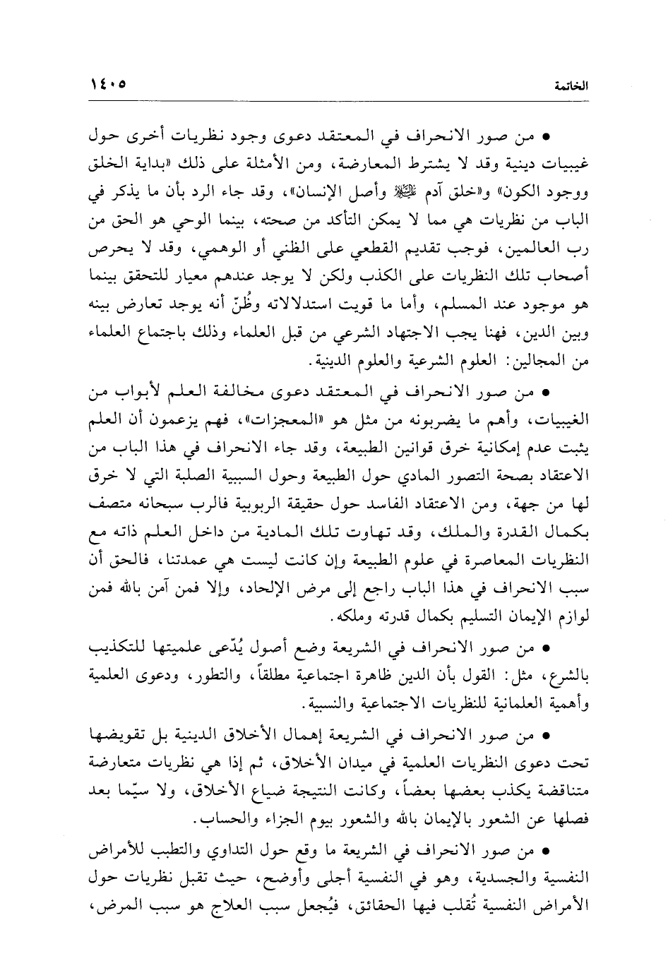 • من صور الانحراف في المعتقد دعوى مخالفة العلم لأبواب من الغيبيات، وأهم ما يضربونه من مثل هو "المعجزات"، فهم يزعمون أن العلم يثبت عدم إمكانية خرق قوانين الطبيعة، وقد جاء الانحراف في هذا الباب من الاعتقاد بصحة التصور المادي حول الطبيعة وحول السببية الصلبة التي لا خرق لها من جهة، ومن الاعتقاد الفاسد حول حقيقة الربوبية فالرب سبحانه متصف بكمال القدرة والملك، وقد تهاوت تلك المادية من داخل العلم ذاته مع النظريات المعاصرة في علوم الطبيعة وإن كانت ليست هي عمدتنا، فالحق أن سبب الانحراف في هذا الباب راجع إلى مرض الإلحاد، وإلا فمن آمن بالله فمن لوازم الإيمان التسليم بكمال قدرته وملكه.