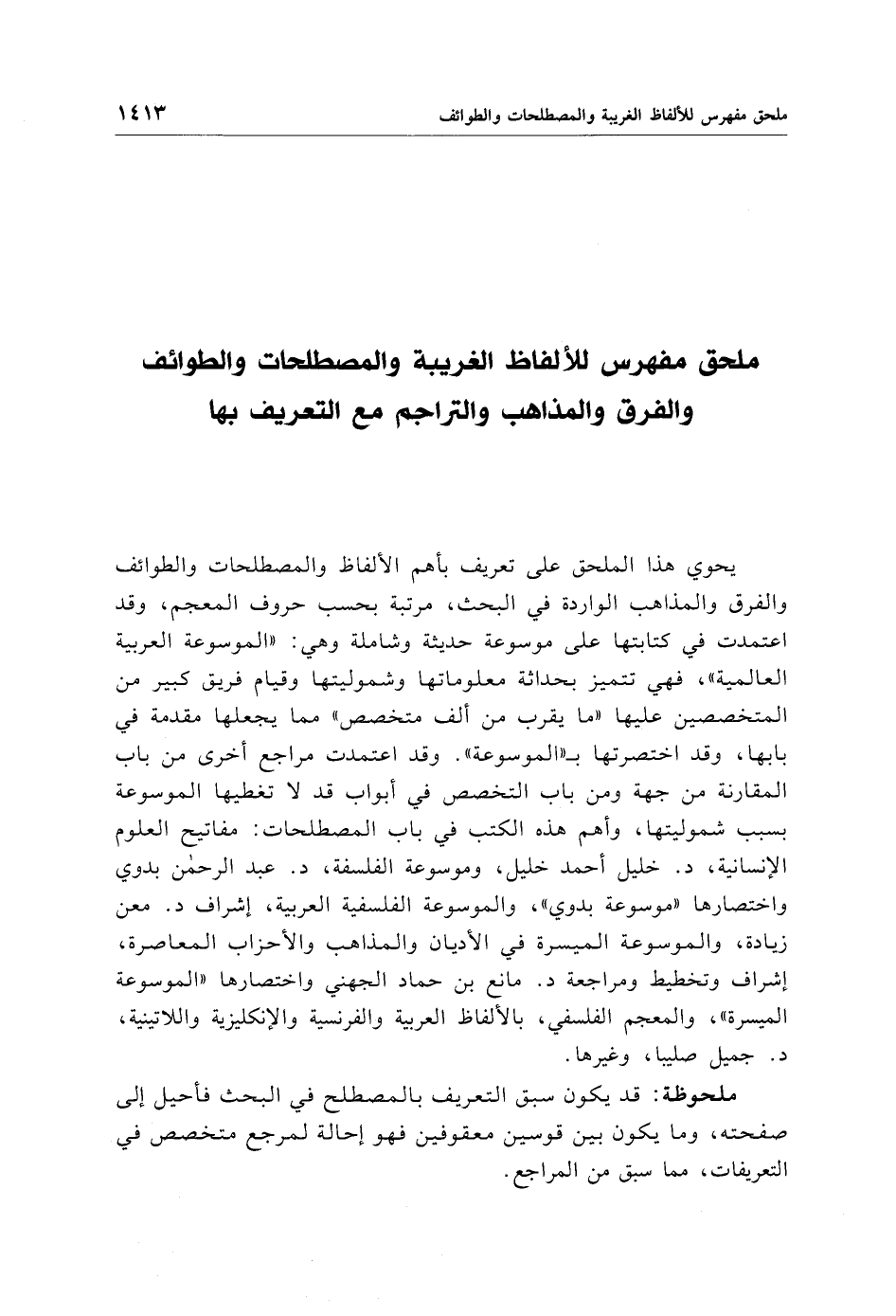 يحوي هذا الملحق على تعريف بأهم الألفاظ والمصطلحات والطوائف والفرق والمذاهب الواردة في البحث، مرتبة بحسب حروف المعجم، وقد اعتمدت في كتابتها على موسوعة حديثة وشاملة وهي: "الموسوعة العربية العالمية"، فهي تتميز بحداثة معلوماتها وشموليتها وقيام فريق كبير من المتخصصين عليها "ما يقرب من ألف متخصص" مما يجعلها مقدمة في بابها، وقد اختصرتها بـ"الموسوعة". وقد اعتمدت مراجع أخرى من باب المقارنة من جهة ومن باب التخصص في أبواب قد لا تغطيها الموسوعة بسبب شموليتها، وأهم هذه الكتب في باب المصطلحات: مفاتيح العلوم الإنسانية، د. خليل أحمد خليل، وموسوعة الفلسفة، د. عبد الرحمن بدوي واختصارها "موسوعة بدوي"، والموسوعة الفلسفية العربية، إشراف د. معن زيادة، والموسوعة الميسرة في الأديان والمذاهب والأحزاب المعاصرة، إشراف وتخطيط ومراجعة د. مانع بن حماد الجهني واختصارها "الموسوعة الميسرة"، والمعجم الفلسفي، بالألفاظ العربية والفرنسية والإنكليزية واللاتينية، د. جميل صليبا، وغيرها.