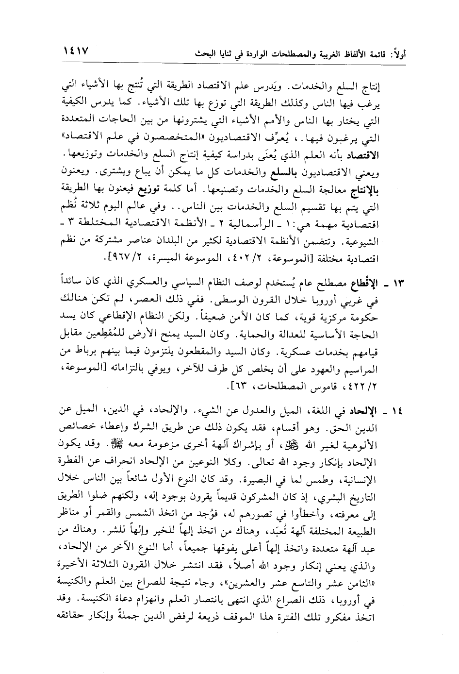 13 - الإقْطاع مصطلح عام يُستخدم لوصف النظام السياسي والعسكري الذي كان سائدًا في غربي أوروبا خلال القرون الوسطى. ففي ذلك العصر، لم تكن هنالك حكومة مركزية قوية، كما كان الأمن ضعيفًا. ولكن النظام الإقطاعي كان يسد الحاجة الأساسية للعدالة والحماية. وكان السيد يمنح الأرض للمُقطِعين مقابل قيامهم بخدمات عسكرية. وكان السيد والمقطعون يلتزمون فيما بينهم برباط من المراسيم والعهود على أن يخلص كل طرف للآخر، ويوفي بالتزاماته [الموسوعة، 2/ 422، قاموس المصطلحات، 63].
