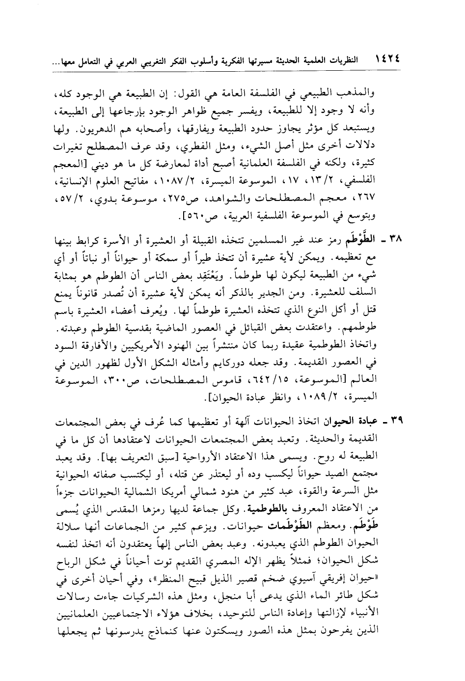 39 - عبادة الحيوان اتخاذ الحيوانات آلهة أو تعظيمها كما عُرف في بعض المجتمعات القديمة والحديثة. وتعبد بعض المجتمعات الحيوانات لاعتقادها أن كل ما في الطبيعة له روح. ويسمى هذا الاعتقاد الأرواحية [سبق التعريف بها]. وقد يعبد مجتمع الصيد حيوانًا ليكسب وده أو ليعتذر عن قتله، أو ليكتسب صفاته الحيوانية مثل السرعة والقوة، عبد كثير من هنود شمالي أمريكا الشمالية الحيوانات جزءًا من الاعتقاد المعروف بالطوطمية. وكل جماعة لديها رمزها المقدس الذي يُسمى طَوْطَم. ومعظم الطَوْطَمات حيوانات. ويزعم كثير من الجماعات أنها سلالة الحيوان الطوطم الذي يعبدونه. وعبد بعض الناس إلهًا يعتقدون أنه اتخذ لنفسه شكل الحيوان؛ فمثلًا يظهر الإله المصري القديم توت أحيانًا في شكل الرباح "حيوان إفريقي آسيوي ضخم قصير الذيل قبيح المنظر"، وفي أحيان أخرى في شكل طائر الماء الذي يدعى أبا منجل، ومثل هذه الشركيات جاءت رسالات الأنبياء لإزالتها وإعادة الناس للتوحيد، بخلاف هؤلاء الاجتماعيين العلمانيين الذين يفرحون بمثل هذه الصور ويسكتون عنها كنماذج يدرسونها ثم يجعلها