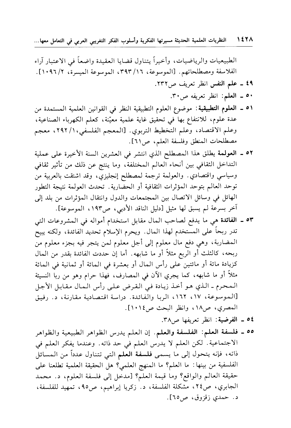 51 - العلوم التطبيقية: موضوع العلوم التطبيقية النظر في القوانين العلمية المستمدة من عدة علوم، للانتفاع بها في تحقيق غاية علمية معيّنة، كعلم الكهرباء الصناعية، وعلم الاقتصاد، وعلم التخطيط التربوي [المعجم الفلسفي، 1/ 292، معجم مصطلحات المنطق وفلسفة العلم، ص 61].