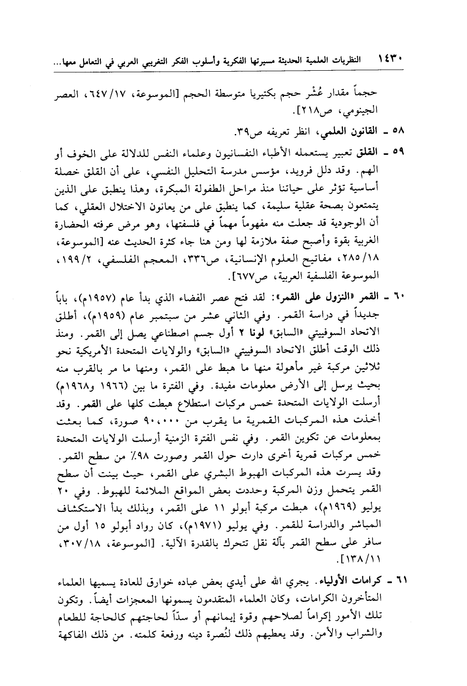 60 - القمر "النزول على القمر": لقد فتح عصر الفضاء الذي بدأ عام (1957 م)، بابًا جديدًا في دراسة القمر. وفي الثاني عشر من سبتمبر عام (1959 م)، أطلق الاتحاد السوفييتي "السابق" لونا 2 أول جسم اصطناعي يصل إلى القمر. ومنذ ذلك الوقت أطلق الاتحاد السوفييتي "السابق" والولايات المتحدة الأمريكية نحو ثلاثين مركبة غير مأهولة منها ما هبط على القمر، ومنها ما مر بالقرب منه بحيث يرسل إلى الأرض معلومات مفيدة. وفي الفترة ما بين (1966 و 1968 م) أرسلت الولايات المتحدة خمس مركبات استطلاع هبطت كلها على القمر. وقد أخذت هذه المركبات القمرية ما يقرب من 000. 90 صورة، كما بعثت بمعلومات عن تكوين القمر. وفي نفس الفترة الزمنية أرسلت الولايات المتحدة خمس مركبات قمرية أخرى دارت حول القمر وصورت 98% من سطح القمر. وقد يسرت هذه المركبات الهبوط البشري على القمر، حيث بينت أن سطح القمر يتحمل وزن المركبة وحددت بعض المواقع الملائمة للهبوط. وفي 20 يوليو (1969 م)، هبطت مركبة أبولو 11 على القمر، وبذلك بدأ الاستكشاف المباشر والدراسة للقمر. وفي يوليو (1971 م)، كان رواد أبولو 15 أول من سافر على سطح القمر بآلة نقل تتحرك بالقدرة الآلية. [الموسوعة، 18/ 307، 11/ 138].