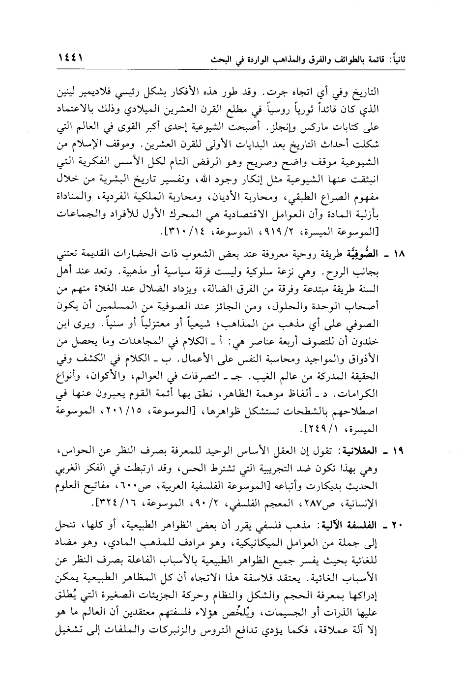 20 - الفلسفة الآلية: مذهب فلسفي يقرر أن بعض الظواهر الطبيعية، أو كلها، تنحل إلى جملة من العوامل الميكانيكية، وهو مرادف للمذهب المادي، وهو مضاد للغائية بحيث يفسر جميع الظواهر الطبيعية بالأسباب الفاعلة بصرف النظر عن الأسباب الغائية. يعتقد فلاسفة هذا الاتجاه أن كل المظاهر الطبيعية يمكن إدراكها بمعرفة الحجم والشكل والنظام وحركة الجزيئات الصغيرة التي يُطلق عليها الذرات أو الجسيمات، ويُلخِّص هؤلاء فلسفتهم معتقدين أن العالم ما هو إلا آلة عملاقة، فكما يؤدي تدافع التروس والزنبركات والملفات إلى تشغيل