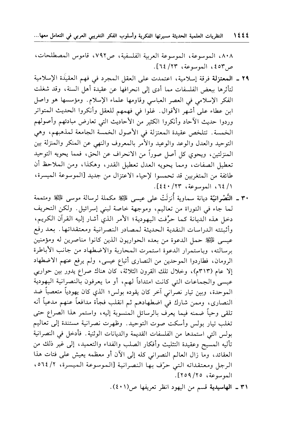 29 - المعتزلة فرقة إسلامية، اعتمدت على العقل المجرد في فهم العقيدة الإسلامية لتأثرها ببعض الفلسفات مما أدى إلى انحرافها عن عقيدة أهل السنة، وقد شغلت الفكر الإسلامي في العصر العباسي وقاومها علماء الإسلام. ومؤسسها هو واصل بن عطاء على أشهر الأقوال. غلوا في فهمهم للعقل وأنكروا الحديث المتواتر وردوا حديث الآحاد وأنكروا الكثير من الأحاديث التي تعارض مبادئهم وأصولهم الخمسة. تتلخص عقيدة المعتزلة في الأصول الخمسة الجامعة لمذهبهم، وهي التوحيد والعدل والوعد والوعيد والأمر بالمعروف والنهي عن المنكر والمنزلة بين المنزلتين، ويحوي كل أصل صورًا من الانحراف عن الحق، فمما يحويه التوحيد تعطيل الصفات، ومما يحويه العدل تعطيل القدر، وهكذا، ومن الملاحظ أن طائفة من المتغربين قد تحمسوا لإحياء الاعتزال من جديد [الموسوعة الميسرة، 1/ 64، الموسوعة، 23/ 440].
