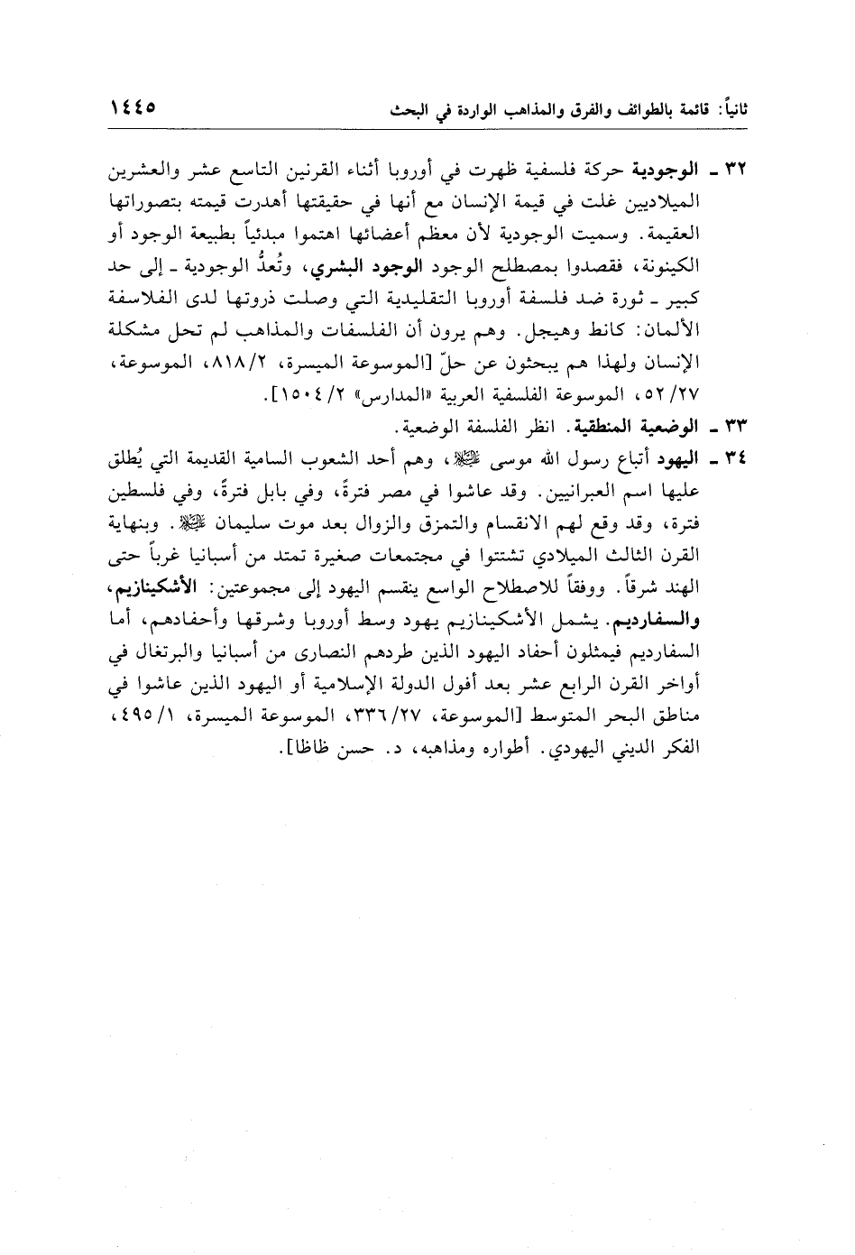 32 - الوجودية حركة فلسفية ظهرت في أوروبا أثناء القرنين التاسع عشر والعشرين الميلاديين غلت في قيمة الإنسان مع أنها في حقيقتها أهدرت قيمته بتصوراتها العقيمة. وسميت الوجودية لأن معظم أعضائها اهتموا مبدئيًا بطبيعة الوجود أو الكينونة، فقصدوا بمصطلح الوجود الوجود البشري، وتُعدُّ الوجودية -إلى حد كبير- ثورة ضد فلسفة أوروبا التقليدية التي وصلت ذروتها لدى الفلاسفة الألمان: كانط وهيجل. وهم يرون أن الفلسفات والمذاهب لم تحل مشكلة الإنسان ولهذا هم يبحثون عن حلّ [الموسوعة الميسرة، 2/ 818، الموسوعة، 27/ 52، الموسوعة الفلسفية العربية "المدارس" 2/ 1504].