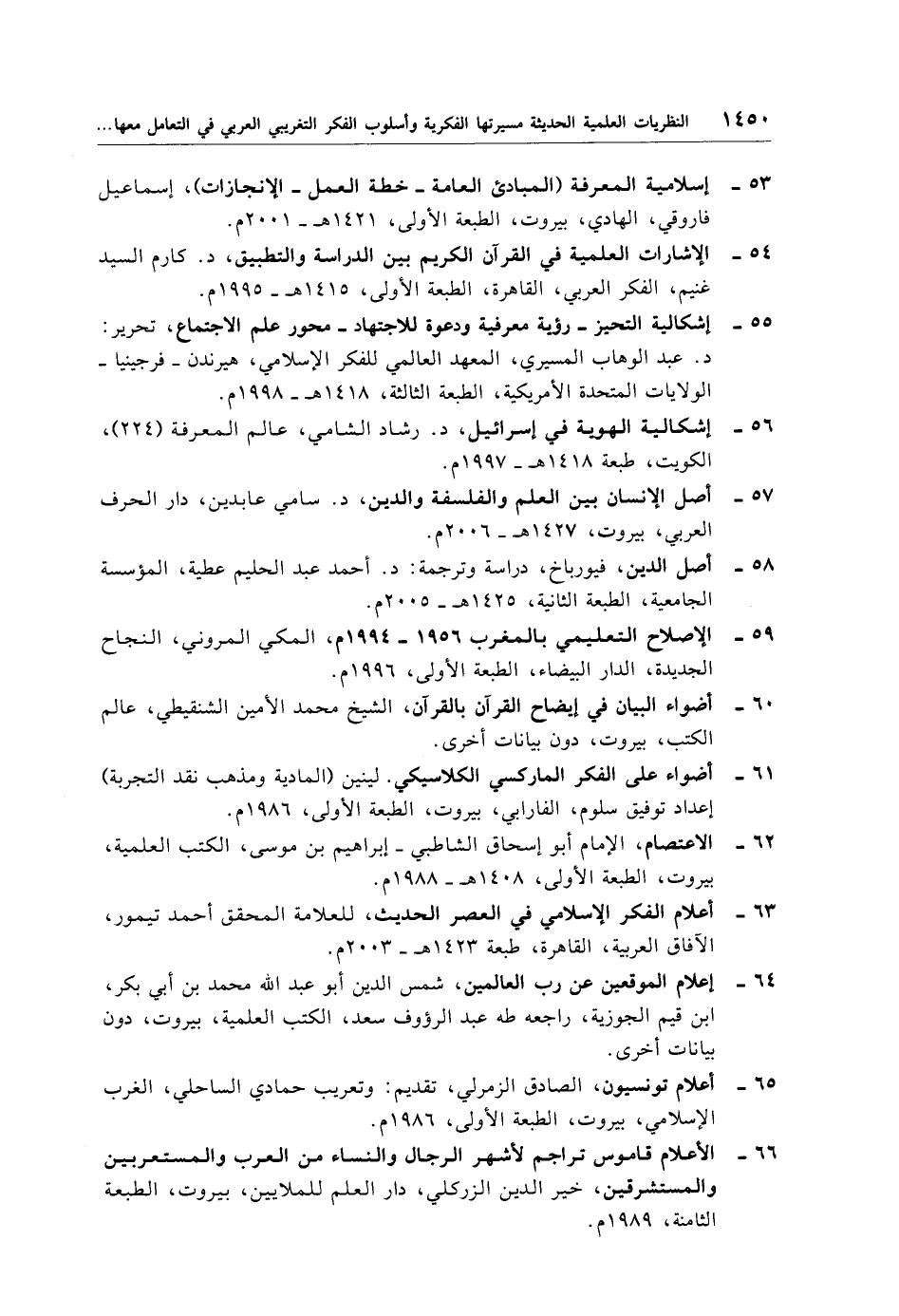 53 - إسلامية المعرفة (المبادئ العامة - خطة العمل - الإنجازات)، إسماعيل فاروقي، الهادي، بيروت، الطبعة الأولى، 1421 هـ - 2001 م.