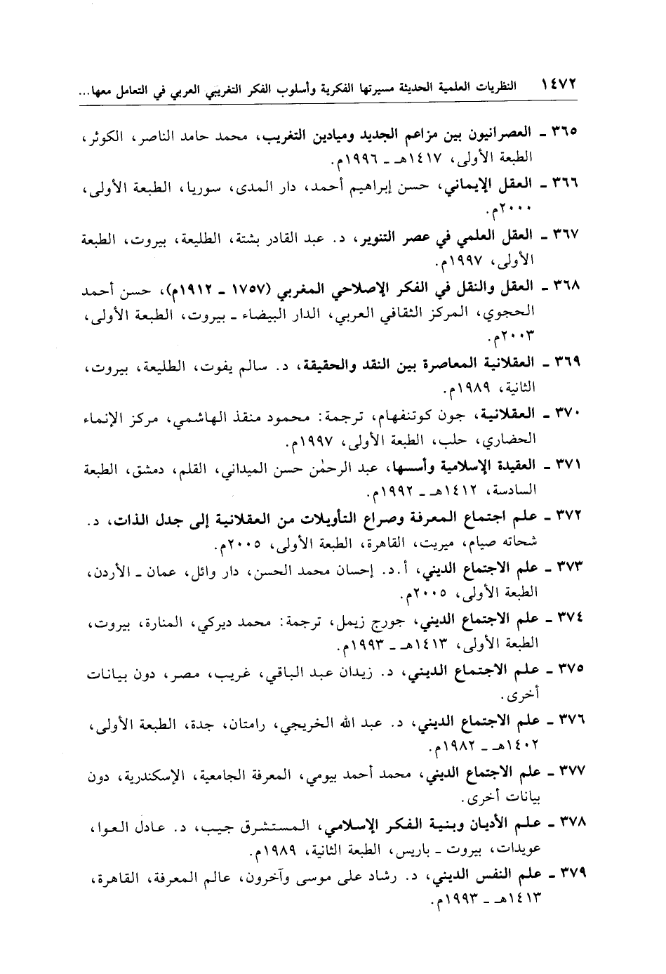 369 - العقلانية المعاصرة بين النقد والحقيقة، د. سالم يفوت، الطليعة، بيروت، الثانية، 1989 م.