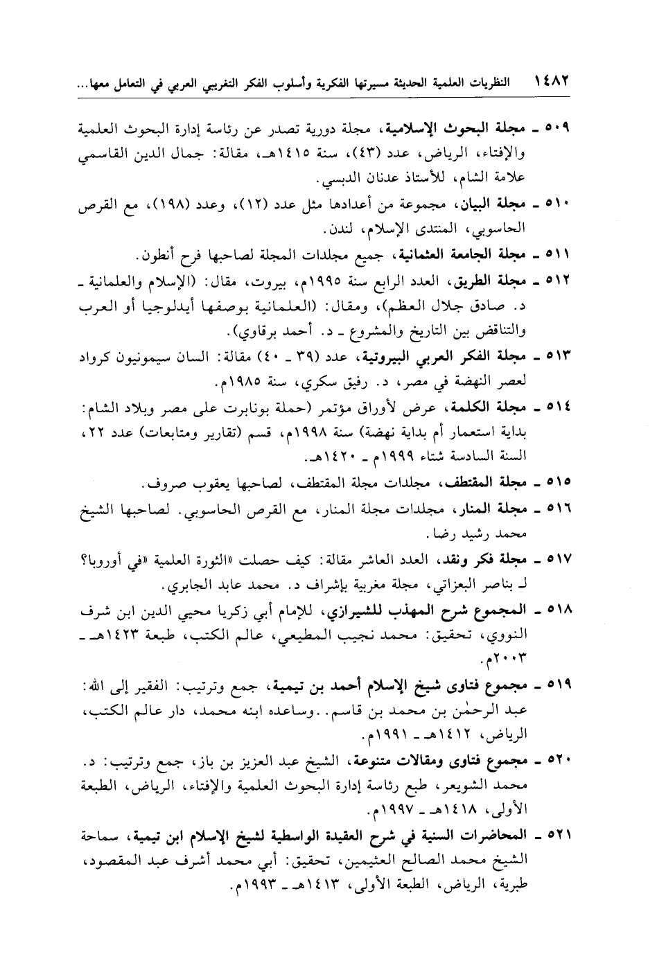 509 - مجلة البحوث الإسلامية، مجلة دورية تصدر عن رئاسة إدارة البحوث العلمية والإفتاء، الرياض، عدد (43)، سنة 1415 هـ، مقالة: جمال الدين القاسمي علامة الشام، للأستاذ عدنان الدبسي.