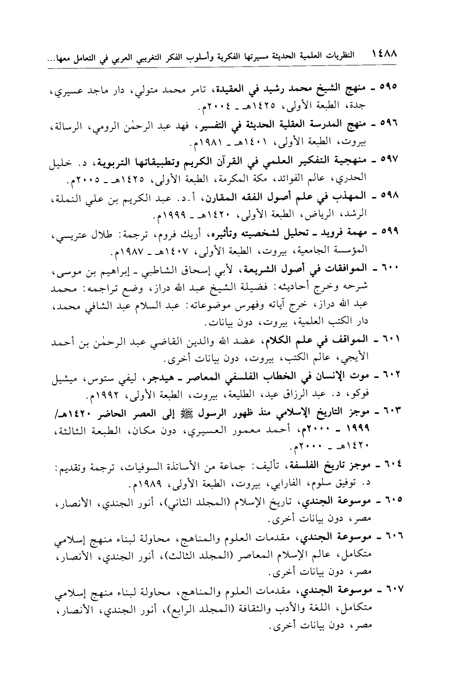 597 - منهجية التفكير العلمي في القرآن الكريم وتطبيقاتها التربوية، د. خليل الحدري، عالم الفوائد، مكة المكرمة، الطبعة الأولى، 1425 هـ - 2005 م.
