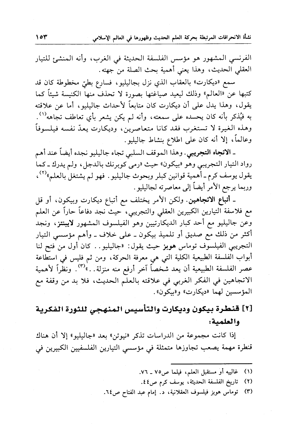 - أتباع الاتجاهين. ولكن الأمر يختلف مع أتباع ديكارت وبيكون، أو قل مع فلاسفة التيارين الكبيرين العقلي والتجريبي، حيث نجد دفاعًا حارًا عن العلم وعن جاليليو مع أحد كبار الديكارتيين وهو الفيلسوف المشهور لايبنتز، ونجد أكثر من ذلك مع صديق أو تلميذ بيكون -على خلاف- وأهم مؤسسي التيار التجريبي الفيلسوف توماس هوبز حيث يقول: "جاليليو. . كان أول من فتح لنا أبواب الفلسفة الطبيعية الكلية التي هي معرفة الحركة، ومن ثم فليس في استطاعة عصر الفلسفة الطبيعية أن يعد شخصًا آخر أرفع منه منزلة. ." (¬3). ونظرًا لأهمية الاتجاهين في الفكر الغربي في علاقته بالعلم الحديث، فلابد من وقفة مع المؤسسين لهما "ديكارت" و"بيكون".