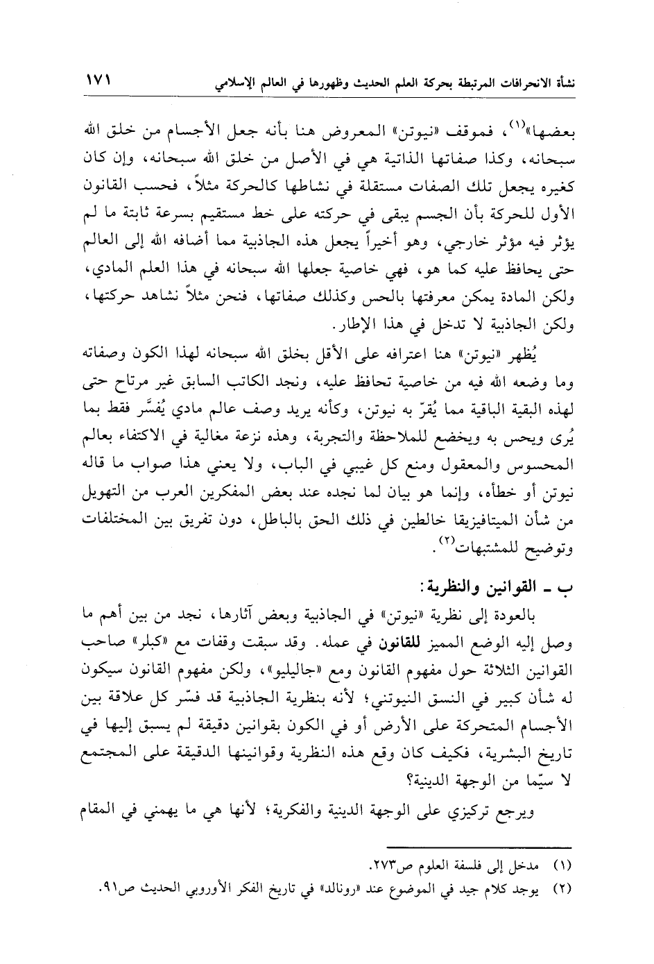 بعضها" (¬1)، فموقف "نيوتن" المعروض هنا بأنه جعل الأجسام من خلق الله سبحانه، وكذا صفاتها الذاتية هي في الأصل من خلق الله سبحانه، وإن كان كغيره يجعل تلك الصفات مستقلة في نشاطها كالحركة مثلًا، فحسب القانون الأول للحركة بأن الجسم يبقى في حركته على خط مستقيم بسرعة ثابتة ما لم يؤثر فيه مؤثر خارجي، وهو أخيرًا يجعل هذه الجاذبية مما أضافه الله إلى العالم حتى يحافظ عليه كما هو، فهي خاصية جعلها الله سبحانه في هذا العلم المادي، ولكن المادة يمكن معرفتها بالحس وكذلك صفاتها، فنحن مثلًا نشاهد حركتها، ولكن الجاذبية لا تدخل في هذا الإطار.
