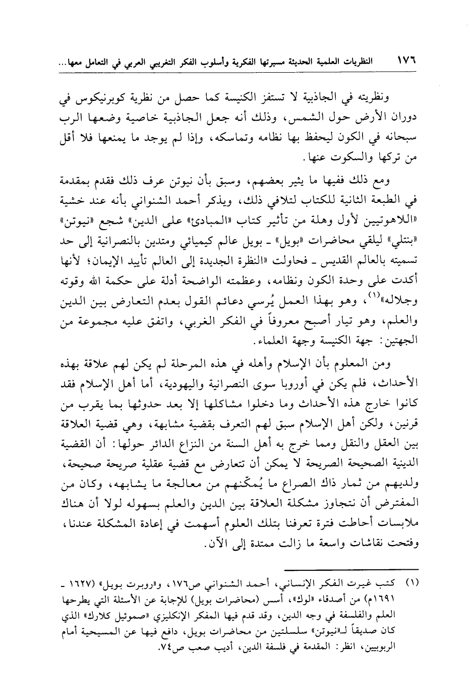 ومع ذلك ففيها ما يثير بعضهم، وسبق بأن نيوتن عرف ذلك فقدم بمقدمة في الطبعة الثانية للكتاب لتلافي ذلك، ويذكر أحمد الشنواني بأنه عند خشية "اللاهوتيين لأول وهلة من تأثير كتاب "المبادئ" على الدين" شجع "نيوتن" "بنتلي" ليلقي محاضرات "بويل" -بويل عالم كيميائي ومتدين بالنصرانية إلى حد تسميته بالعالم القديس- فحاولت "النظرة الجديدة إلى العالم تأييد الإيمان؛ لأنها أكدت على وحدة الكون ونظامه، وعظمته الواضحة أدلة على حكمة الله وقوته وجلاله" (¬1)، وهو بهذا العمل يُرسي دعائم القول بعدم التعارض بين الدين والعلم، وهو تيار أصبح معروفًا في الفكر الغربي، واتفق عليه مجموعة من الجهتين: جهة الكنيسة وجهة العلماء.