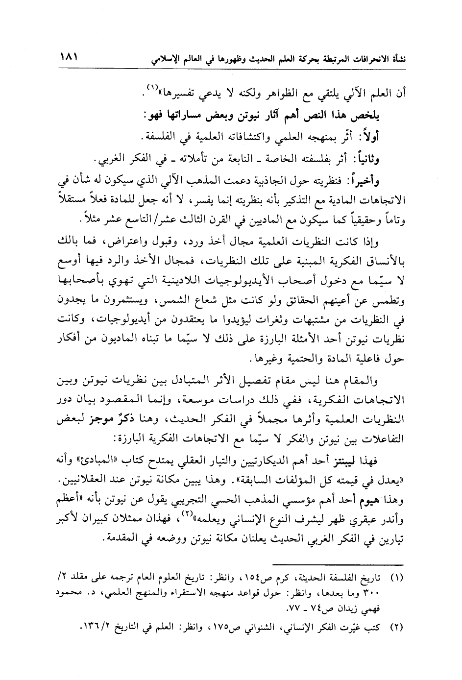 فهذا ليبنتز أحد أهم الديكارتيين والتيار العقلي يمتدح كتاب "المبادئ" وأنه "يعدل في قيمته كل المؤلفات السابقة". وهذا يبين مكانة نيوتن عند العقلانيين. وهذا هيوم أحد أهم مؤسسي المذهب الحسي التجريبي يقول عن نيوتن بأنه "أعظم وأندر عبقري ظهر ليشرف النوع الإنساني ويعلمه" (¬2)، فهذان ممثلان كبيران لأكبر تيارين في الفكر الغربي الحديث يعلنان مكانة نيوتن ووضعه في المقدمة.