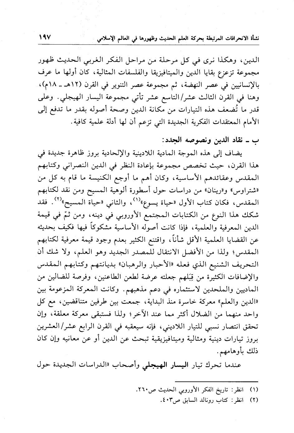 الدين، وهكذا نرى في كل مرحلة من مراحل الفكر الغربي الحديث ظهور مجموعة تزعزع بقايا الدين والميتافيزيقا والفلسفات المثالية، كان أولها ما عرف بالإنسانيين في عصر النهضة، ثم مجموعة عصر التنوير في القرن (12 هـ - 18 م)، وهنا في القرن الثالث عشر/ التاسع عشر تأتي مجموعة اليسار الهيجلي. وعلى قدر ما تُضعف هذه التيارات من مكانة الدين وصحة أصوله بقدر ما تدفع إلى الأمام المعتقدات الفكرية الجديدة التي تزعم أن لها أدلة علمية كافية.