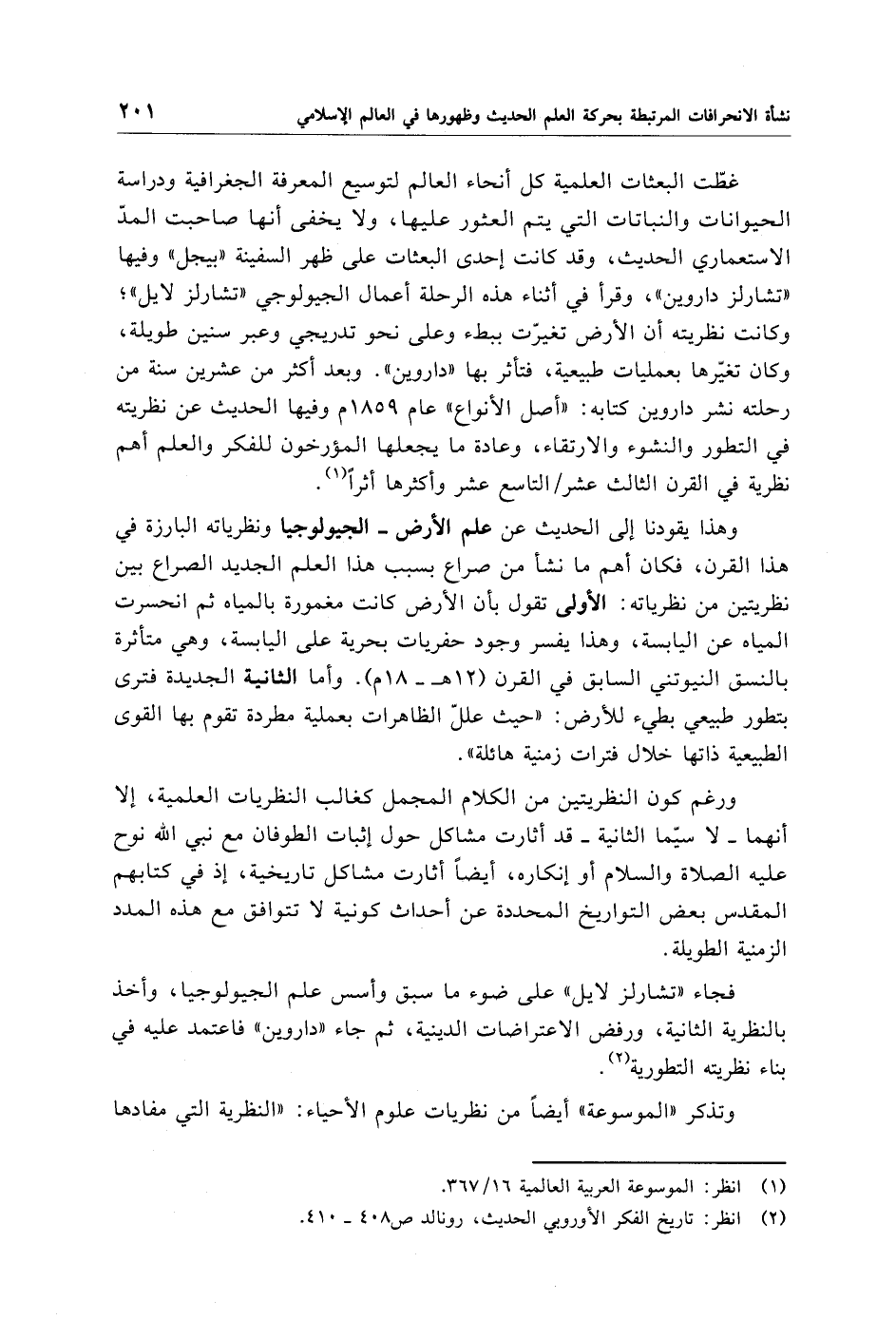 وهذا يقودنا إلى الحديث عن علم الأرض -الجيولوجيا ونظرياته البارزة في هذا القرن، فكان أهم ما نشأ من صراع بسبب هذا العلم الجديد الصراع بين نظريتين من نظرياته: الأولى تقول بأن الأرض كانت مغمورة بالمياه ثم انحسرت المياه عن اليابسة، وهذا يفسر وجود حفريات بحرية على اليابسة، وهي متأثرة بالنسق النيوتني السابق في القرن (12 هـ- 18 م). وأما الثانية الجديدة فترى بتطور طبيعي بطيء للأرض: "حيث علل الظاهرات بعملية مطردة تقوم بها القوى الطبيعية ذاتها خلال فترات زمنية هائلة".