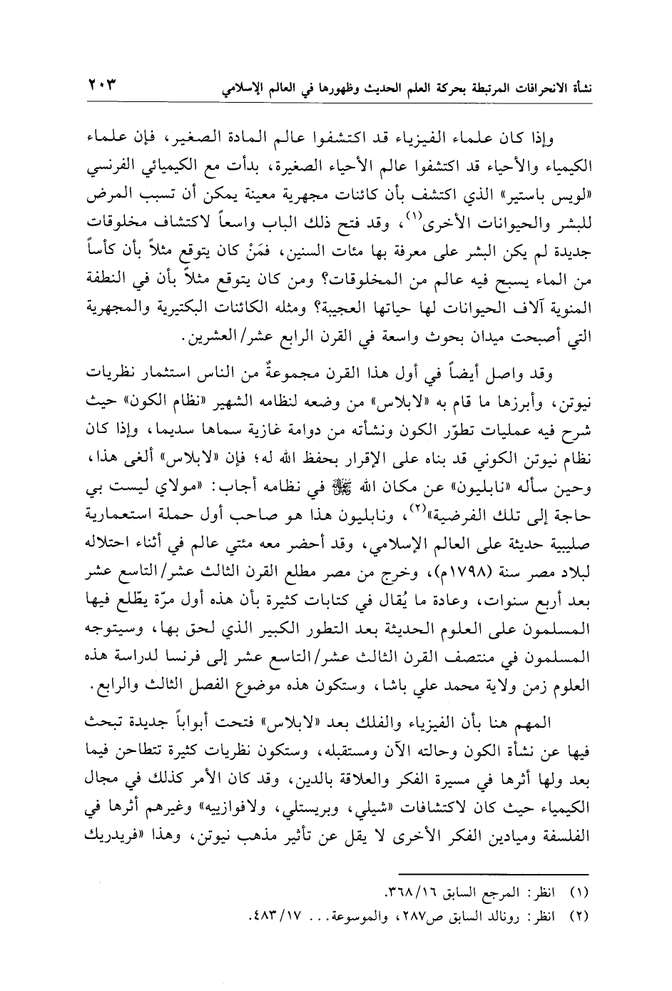 وقد واصل أيضًا في أول هذا القرن مجموعةٌ من الناس استثمار نظريات نيوتن، وأبرزها ما قام به "لابلاس" من وضعه لنظامه الشهير "نظام الكون" حيث شرح فيه عمليات تطوّر الكون ونشأته من دوامة غازية سماها سديما، وإذا كان نظام نيوتن الكوني قد بناه على الإقرار بحفظ الله له؛ فإن "لابلاس" ألغى هذا، وحين سأله "نابليون" عن مكان الله - سبحانه وتعالى - في نظامه أجاب: "مولاي ليست بي حاجة إلى تلك الفرضية" (¬2)، ونابليون هذا هو صاحب أول حملة استعمارية صليبية حديثة على العالم الإِسلامي، وقد أحضر معه مئتي عالم في أثناء احتلاله لبلاد مصر سنة (1798 م)، وخرج من مصر مطلع القرن الثالث عشر/ التاسع عشر بعد أربع سنوات، وعادة ما يُقال في كتابات كثيرة بأن هذه أول مرّة يطّلع فيها المسلمون على العلوم الحديثة بعد التطور الكبير الذي لحق بها، وسيتوجه المسلمون في منتصف القرن الثالث عشر/ التاسع عشر إلى فرنسا لدراسة هذه العلوم زمن ولاية محمَّد علي باشا، وستكون هذه موضوع الفصل الثالث والرابع.