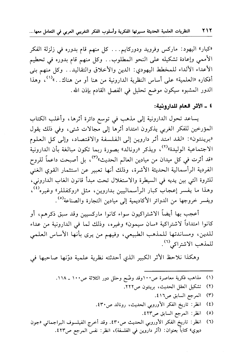 (¬6) انظر: تاريخٍ الفكر الأوروبي الحديث ص 430. وقد أخرج الفيلسوف البراجماتي "جون ديوي" كتابا بعنوان: (أثر داروين في الفلسفة)، انظر: نفس المرجع ص 423.