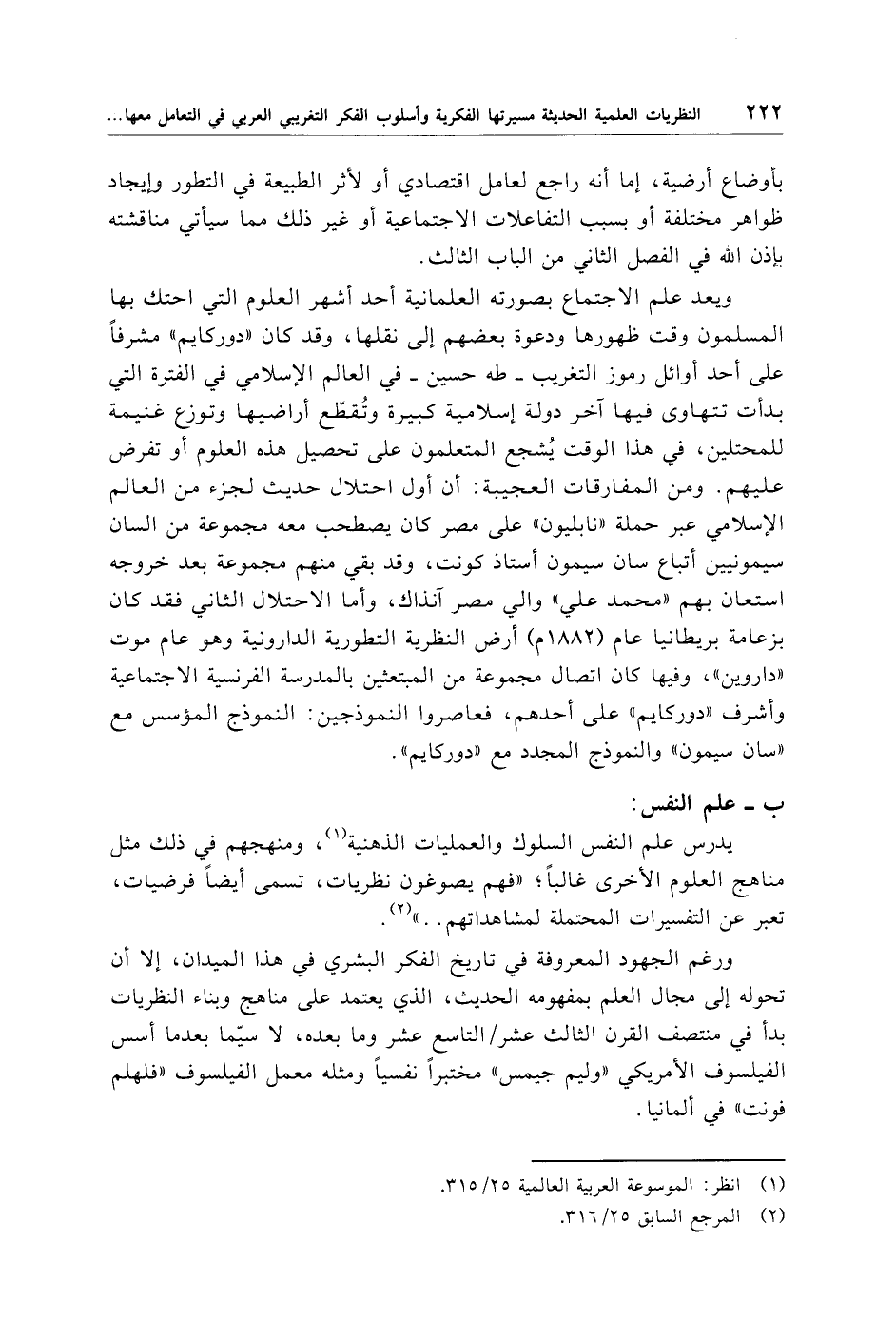 ويعد علم الاجتماع بصورته العلمانية أحد أشهر العلوم التي احتك بها المسلمون وقت ظهورها ودعوة بعضهم إلى نقلها، وقد كان "دوركايم" مشرفًا على أحد أوائل رموز التغريب -طه حسين- في العالم الإِسلامي في الفترة التي بدأت تتهاوى فيها آخر دولة إسلامية كبيرة وتُقطّع أراضيها وتوزع غنيمة للمحتلين، في هذا الوقت يُشجع المتعلمون على تحصيل هذه العلوم أو تفرض عليهم. ومن المفارقات العجيبة: أن أول احتلال حديث لجزء من العالم الإِسلامي عبر حملة "نابليون" على مصر كان يصطحب معه مجموعة من السان سيمونيين أتباع سان سيمون أستاذ كونت، وقد بقي منهم مجموعة بعد خروجه استعان بهم "محمَّد علي" والي مصر آنذاك، وأما الاحتلال الثاني فقد كان بزعامة بريطانيا عام (1882 م) أرض النظرية التطورية الدارونية وهو عام موت "داروين"، وفيها كان اتصال مجموعة من المبتعثين بالمدرسة الفرنسية الاجتماعية وأشرف "دوركايم" على أحدهم، فعاصروا النموذجين: النموذج المؤسس مع "سان سيمون" والنموذج المجدد مع "دوركايم".