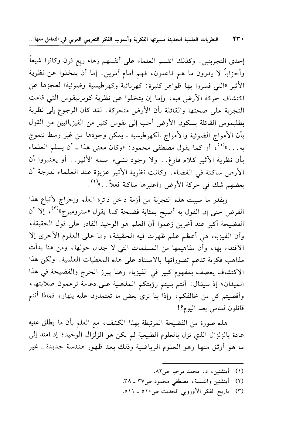 إحدى التجربتين. وكذلك انقسم العلماء على أنفسهم زهاء ربع قرن وكانوا شيعًا وأحزابًا لا يدرون ما هم فاعلون، فهم أمام أمرين: إما أن يتخلوا عن نظرية الأثير "التي فسروا بها ظواهر كثيرة: كهربائية وكهرطيسية وضوئية" لعجزها عن اكتشاف حركة الأرض فيه، وإما إن يتخلوا عن نظرية كوبرنيقوس التي قامت التجربة على صحتها والقائلة بأن الأرض متحركة. لقد كان الرجوع إلى نظرية بطليموس القائلة بسكون الأرض أحب إلى نفوس كثير من الفيزيائيين من القول بأن الأمواج الضوئية والأمواج الكهرطيسية -يمكن وجودها من غير وسط تتموج به. . . ." (¬1)، أو كما يقول مصطفى محمود: "وكان معنى هذا -أن يسلم العلماء بأن نظرية الأثير كلام فارغ. . ولا وجود لشيء اسمه الأثير. . أو يعتبروا أن الأرض ساكنة في الفضاء. وكانت نظرية الأثير عزيزة عند العلماء لدرجة أن بعضهم شك في حركة الأرض واعتبرها ساكنة فعلًا. ." (¬2).