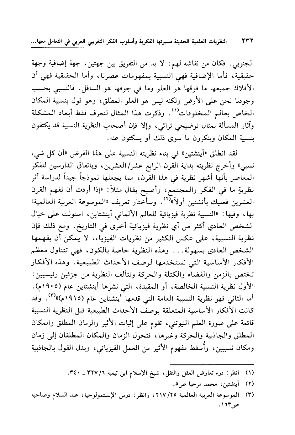 الجنوبي. فكان من نقاشه لهم: لابد من التفريق بين جهتين، جهة إضافية وجهة حقيقية، فأما الإضافية فهي النسبية بمفهومات عصرنا، وأما الحقيقية فهي أن الأفلاك جميعها ما فوقها هو العلو وما في جوفها هو السافل. فالنسبي بحسب وجودنا نحن على الأرض ولكنه ليس هو العلو المطلق، وهو قول بنسبية المكان الخاص بعالم المخلوقات (¬1). وذكرت هذا المثال لنعرف فقط أبعاد المشكلة وآثار المسألة بمثال توضيحي تراثي، وإلا فإن أصحاب النظرية النسبية قد يكتفون بنسبية المكان وينكرون ما سوى ذلك أو يسكتون عنه.