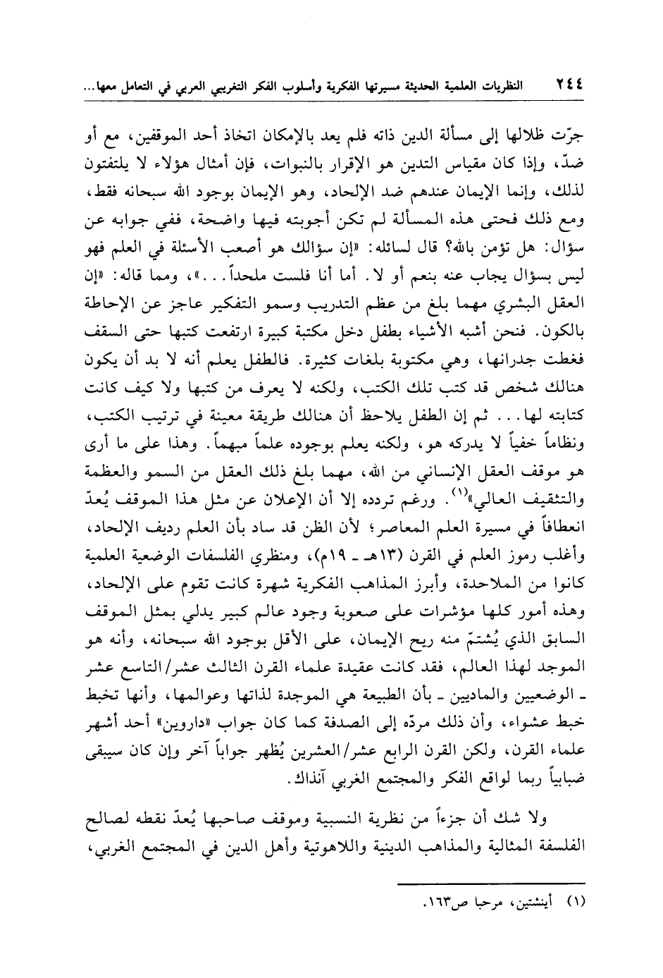 جرّت ظلالها إلى مسألة الدين ذاته فلم يعد بالإمكان اتخاذ أحد الموقفين، مع أو ضدّ، وإذا كان مقياس التدين هو الإقرار بالنبوات، فإن أمثال هؤلاء لا يلتفتون لذلك، وإنما الإيمان عندهم ضد الإلحاد، وهو الإيمان بوجود الله سبحانه فقط، ومع ذلك فحتى هذه المسألة لم تكن أجوبته فيها واضحة، ففي جوابه عن سؤال: هل تؤمن بالله؟ قال لسائله: "إن سؤالك هو أصعب الأسئلة في العلم فهو ليس بسؤال يجاب عنه بنعم أو لا. أما أنا فلست ملحدًا. . . ."، ومما قاله: "إن العقل البشري مهما بلغ من عظم التدريب وسمو التفكير عاجز عن الإحاطة بالكون. فنحن أشبه الأشياء بطفل دخل مكتبة كبيرة ارتفعت كتبها حتى السقف فغطت جدرانها، وهي مكتوبة بلغات كثيرة. فالطفل يعلم أنه لابد أن يكون هنالك شخص قد كتب تلك الكتب، ولكنه لا يعرف من كتبها ولا كيف كانت كتابته لها. . . . ثم إن الطفل يلاحظ أن هنالك طريقة معينة في ترتيب الكتب، ونظامًا خفيًا لا يدركه هو، ولكنه يعلم بوجوده علمًا مبهمًا. وهذا على ما أرى هو موقف العقل الإنساني من الله، مهما بلغ ذلك العقل من السمو والعظمة والتثقيف العالي" (¬1). ورغم تردده إلا أن الإعلان عن مثل هذا الموقف يُعدّ انعطافًا في مسيرة العلم المعاصر؛ لأن الظن قد ساد بأن العلم رديف الإلحاد، وأغلب رموز العلم في القرن (13 هـ - 19 م)، ومنظري الفلسفات الوضعية العلمية كانوا من الملاحدة، وأبرز المذاهب الفكرية شهرة كانت تقوم على الإلحاد، وهذه أمور كلها مؤشرات على صعوبة وجود عالم كبير يدلي بمثل الموقف السابق الذي يُشتمّ منه ريح الإيمان، على الأقل بوجود الله سبحانه، وأنه هو الموجد لهذا العالم، فقد كانت عقيدة علماء القرن الثالث عشر/ التاسع عشر -الوضعيين والماديين- بأن الطبيعة هي الموجدة لذاتها وعوالمها، وأنها تخبط خبط عشواء، وأن ذلك مردّه إلى الصدفة كما كان جواب "داروين" أحد أشهر علماء القرن، ولكن القرن الرابع عشر/ العشرين يُظهر جوابًا آخر وإن كان سيبقى ضبابيًا ربما لواقع الفكر والمجتمع الغربي آنذاك.