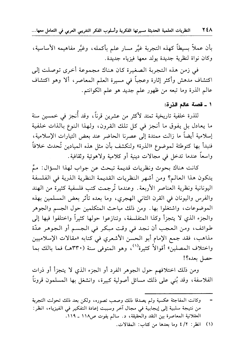 كانت هناك بحوث ونظريات قديمة تبحث عن جواب لهذا السؤال: ممَّ يتكون هذا العالم؟ ومن أشهر النظريات القديمة النظرية الذرية في الفلسفة اليونانية ونظرية العناصر الأربعة. وعندما تُرجمت كتب فلسفية كثيرة من الهند والفرس واليونان في القرن الثاني الهجري، وما بعده تأثر بعض المسلمين بهذه الموضوعات، واشتغلوا بها. ومن ذلك مباحث المتكلمين حول الجسم والجوهر والجزء الذي لا يتجزأ وكذا المتفلسفة، وتنازعوا حولها كثيرًا واختلفوا فيها إلى طوائف، ومن العجب أن نجد في وقت مبكر في الجسم أو الجوهر عدّة مذاهب، فقد جمع الإِمام أبو الحسن الأشعري في كتابه "مقالات الإِسلاميين واختلاف المصلين" أقوالًا كثيرة (¬1)، وهو المتوفى سنة (330 هـ) فما بالك بما حصل بعده؟!