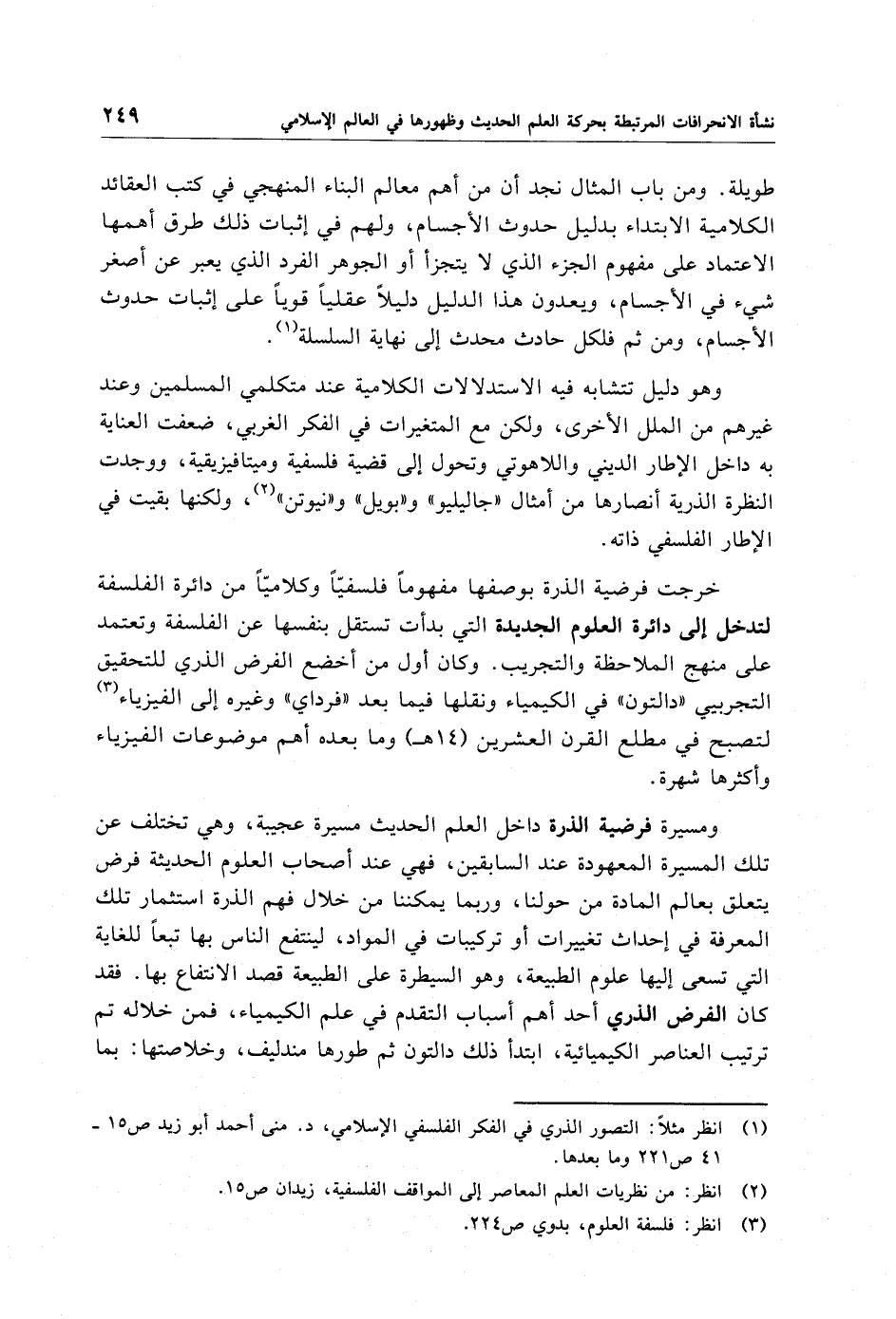 وهو دليل تتشابه فيه الاستدلالات الكلامية عند متكلمي المسلمين وعند غيرهم من الملل الأخرى، ولكن مع المتغيرات في الفكر الغربي، ضعفت العناية به داخل الإطار المديني واللاهوتي وتحول إلى قضية فلسفية وميتافيزيقية، ووجدت النظرة الذرية أنصارها من أمثال "جاليليو" و"بويل" و"نيوتن" (¬2)، ولكنها بقيت في الإطار الفلسفي ذاته.