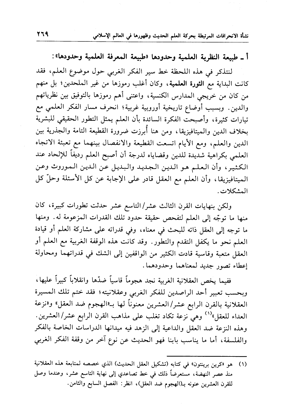 (¬1) هو "كرين برينتون" في كتابه (تشكيل العقل الحديث) الذي خصصه لمتابعة هذه العقلانية منذ عصر النهضة، مستعرضًا ذلك في خط تصاعدي إلى نهاية التاسع عشر، وعندما وصل للقرن العشرين عنونه بـ (الهجوم ضد العقل)، انظر: الفصل السابع والثامن.