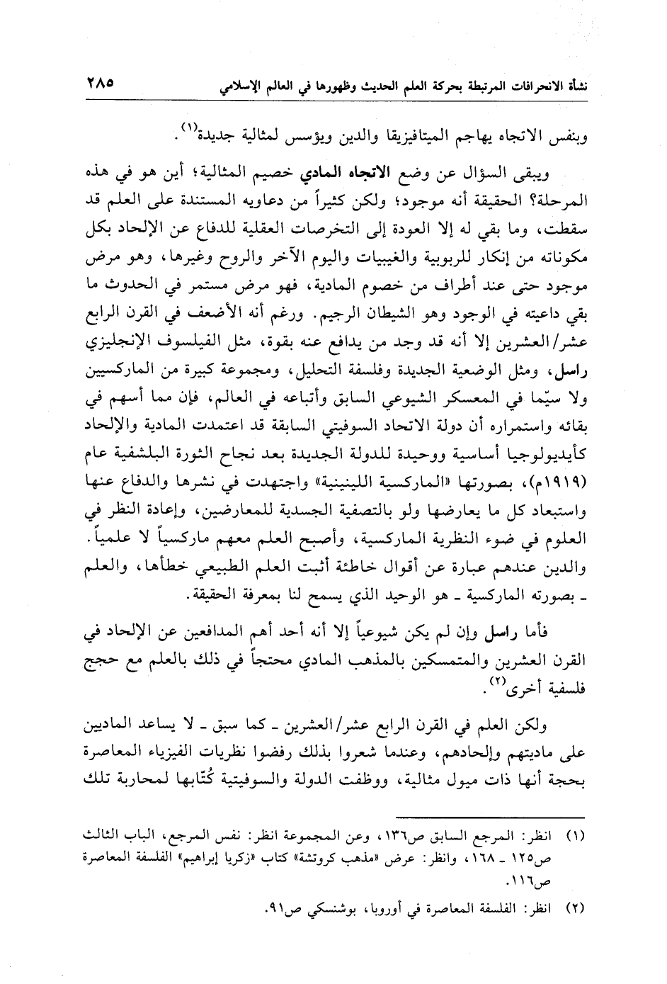 فأما راسل وإن لم يكن شيوعيًا إلا أنه أحد أهم المدافعين عن الإلحاد في القرن العشرين والمتمسكين بالمذهب المادي محتجًا في ذلك بالعلم مع حجج فلسفية أخرى (¬2).