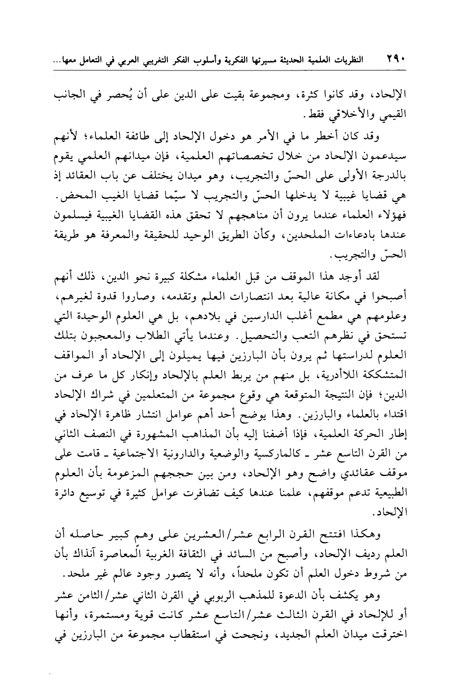 وهكذا افتتح القرن الرابع عشر/ العشرين على وهمٍ كبير حاصله أن العلم رديف الإلحاد، وأصبح من السائد في الثقافة الغربية المعاصرة آنذاك بأن من شروط دخول العلم أن تكون ملحدًا، وأنه لا يتصور وجود عالم غير ملحد.