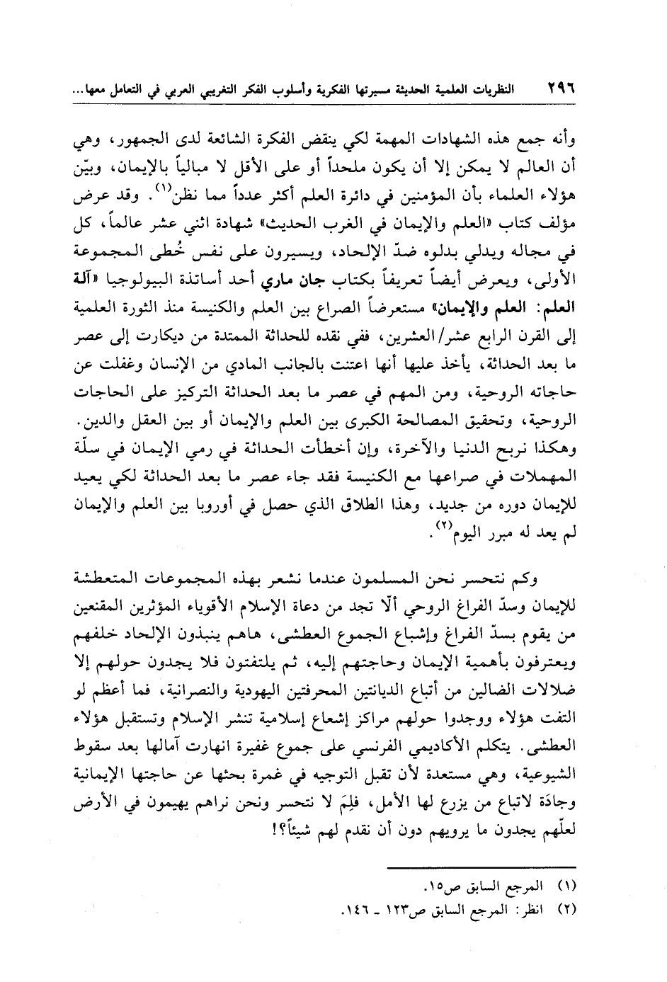 وأنه جمع هذه الشهادات المهمة لكي ينقض الفكرة الشائعة لدى الجمهور، وهي أن العالم لا يمكن إلا أن يكون ملحدًا أو على الأقل لا مباليًا بالإيمان, وبيّن هؤلاء العلماء بأن المؤمنين في دائرة العلم أكثر عددًا مما نظن (¬1). وقد عرض مؤلف كتاب "العلم والإيمان في الغرب الحديث" شهادة اثني عشر عالمًا، كل في مجاله ويدلي بدلوه ضدّ الإلحاد، ويسيرون على نفس خُطى المجموعة الأولى، ويعرض أيضًا تعريفًا بكتاب جان ماري أحد أساتذة البيولوجيا "آلة العلم: العلم والايمان" مستعرضًا الصراع بين العلم والكنيسة منذ الثورة العلمية إلى القرن الرابع عشر/ العشرين، ففي نقده للحداثة الممتدة من ديكارت إلى عصر ما بعد الحداثة، يأخذ عليها أنها اعتنت بالجانب المادي من الإنسان وغفلت عن حاجاته الروحية، ومن المهم في عصر ما بعد الحداثة التركيز على الحاجات الروحية، وتحقيق المصالحة الكبرى بين العلم والإيمان أو بين العقل والدين. وهكذا نربح الدنيا والآخرة، وإن أخطأت الحداثة في رمي الإيمان في سلّة المهملات في صراعها مع الكنيسة فقد جاء عصر ما بعد الحداثة لكي يعيد للإيمان دوره من جديد، وهذا الطلاق الذي حصل في أوروبا بين العلم والإيمان لم يعد له مبرر اليوم (¬2).