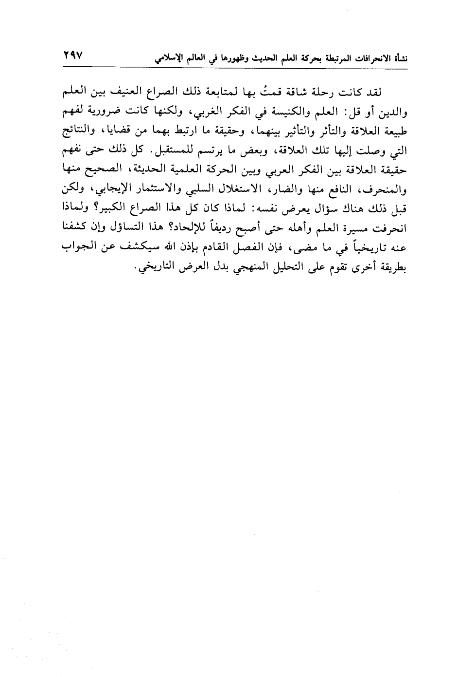 لقد كانت رحلة شاقة قمتُ بها لمتابعة ذلك الصراع العنيف بين العلم والدين أو قل: العلم والكنيسة في الفكر الغربي، ولكنها كانت ضرورية لفهم طبيعة العلاقة والتأثر والتأثير بينهما، وحقيقة ما ارتبط بهما من قضايا، والنتائج التي وصلت إليها تلك العلاقة، وبعض ما يرتسم للمستقبل. كل ذلك حتى نفهم حقيقة العلاقة بين الفكر العربي وبين الحركة العلمية الحديثة، الصحيح منها والمنحرف، النافع منها والضار، الاستغلال السلبي والاستثمار الإيجابي، ولكن قبل ذلك هناك سؤال يعرض نفسه: لماذا كان كل هذا الصراع الكبير؟ ولماذا انحرفت مسيرة العلم وأهله حتى أصبح رديفًا للإلحاد؟ هذا التساؤل وإن كشفنا عنه تاريخيًا في ما مضى، فإن الفصل القادم بإذن الله سيكشف عن الجواب بطريقة أخرى تقوم على التحليل المنهجي بدل العرض التاريخي.