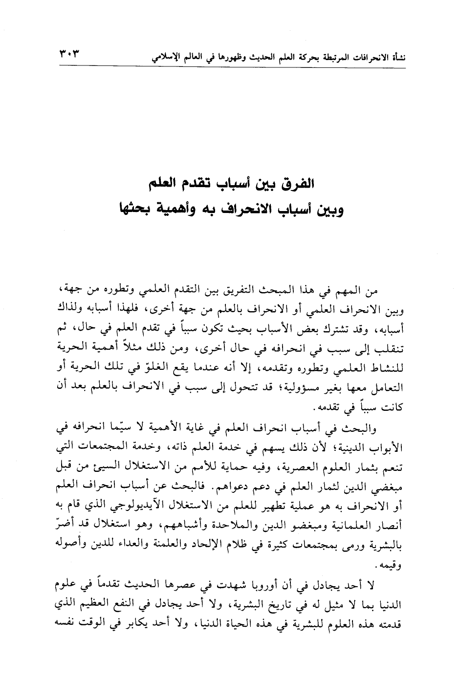 من المهم في هذا المبحث التفريق بين التقدم العلمي وتطوره من جهة، وبين الانحراف العلمي أو الانحراف بالعلم من جهة أخرى، فلهذا أسبابه ولذاك أسبابه، وقد تشترك بعض الأسباب بحيث تكون سببًا في تقدم العلم في حال، ثم تنقلب إلى سبب في انحرافه في حال أخرى، ومن ذلك مثلًا أهمية الحرية للنشاط العلمي وتطوره وتقدمه، إلا أنه عندما يقع الغلوّ في تلك الحرية أو التعامل معها بغير مسؤولية؛ قد تتحول إلى سبب في الانحراف بالعلم بعد أن كانت سببًا في تقدمه.