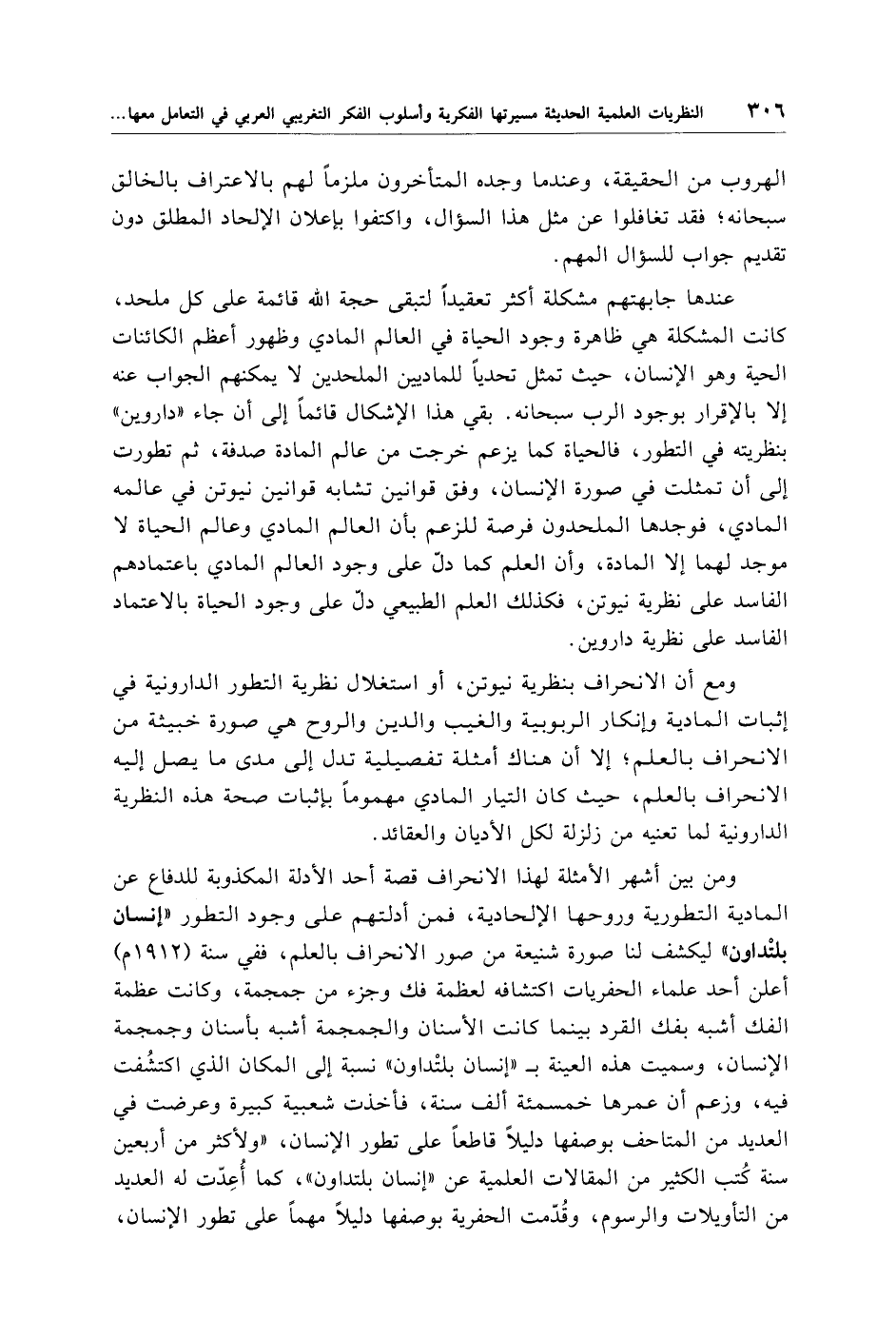 عندها جابهتهم مشكلة أكثر تعقيدًا لتبقى حجة الله قائمة على كل ملحد، كانت المشكلة هي ظاهرة وجود الحياة في العالم المادي وظهور أعظم الكائنات الحية وهو الإنسان، حيث تمثل تحديًا للماديين الملحدين لا يمكنهم الجواب عنه إلا بالإقرار بوجود الرب سبحانه. بقي هذا الإشكال قائمًا إلى أن جاء "داروين" بنظريته في التطور، فالحياة كما يزعم خرجت من عالم المادة صدفة، ثم تطورت إلى أن تمثلت في صورة الإنسان، وفق قوانين تشابه قوانين نيوتن في عالمه المادي، فوجدها الملحدون فرصة للزعم بأن العالم المادي وعالم الحياة لا موجد لهما إلا المادة، وأن العلم كما دلّ على وجود العالم المادي باعتمادهم الفاسد على نظرية نيوتن، فكذلك العلم الطبيعي دلّ على وجود الحياة بالاعتماد الفاسد على نظرية داروين.