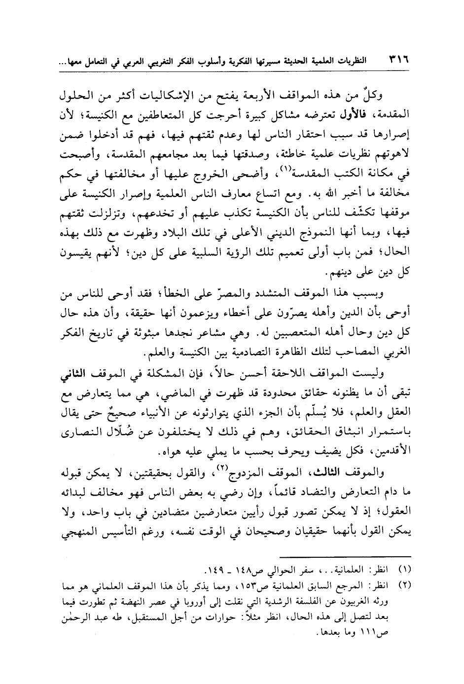 (¬2) انظر: المرجع السابق العلمانية ص 153، ومما يذكر بأن هذا الموقف العلماني هو مما ورثه الغربيون عن الفلسفة الرشدية التي نقلت إلى أوروبا في عصر النهضة ثم تطورت فيما بعد لتصل إلى هذه الحال، انظر مثلًا: حوارات من أجل المستقبل، طه عبد الرحمن ص 111 وما بعدها.