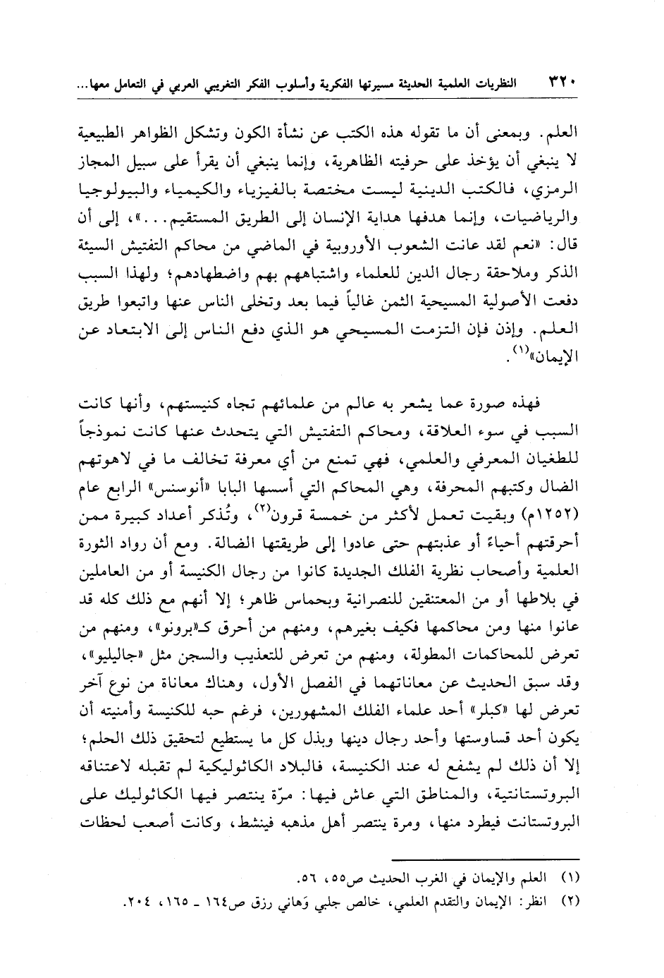العلم. وبمعنى أن ما تقوله هذه الكتب عن نشأة الكون وتشكل الظواهر الطبيعية لا ينبغي أن يؤخذ على حرفيته الظاهرية، وإنما ينبغي أن يقرأ على سبيل المجاز الرمزي، فالكتب الدينية ليست مختصة بالفيزياء والكيمياء والبيولوجيا والرياضيات، وإنما هدفها هداية الإنسان إلى الطريق المستقيم. . . ."، إلى أن قال: "نعم لقد عانت الشعوب الأوروبية في الماضي من محاكم التفتيش السيئة الذكر وملاحقة رجال الدين للعلماء واشتباههم بهم واضطهادهم؛ ولهذا السبب دفعت الأصولية المسيحية الثمن غاليًا فيما بعد وتخلى الناس عنها واتبعوا طريق العلم. وإذن فإن التزمت المسيحي هو الذي دفع الناس إلى الابتعاد عن الإيمان" (¬1).