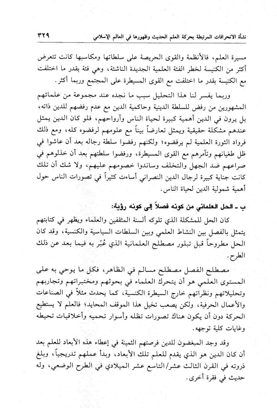 وربما يفسر لنا هذا التحليل سبب ما نجده عند مجموعة من علمائهم المشهورين من رفض للسلطة الدينية وحاكمية الدين مع عدم رفضهم للدين ذاته، بل يرون في الدين أهمية كبيرة لحياة الناس وأرواحهم، فلو كان الدين يمثل عندهم مشكلة حقيقية ويمثل تعارضًا بينًا مع علومهم لرفضوه كله، ومع ذلك فرواد الثورة العلمية لم يرفضوه؛ ولكنهم رفضوا سلطة رجاله بعد أن عاشوا في ظل طغيانهم وتآمرهم مع القوى المسيطرة، ورفضوا سلطتهم بعد أن خذلوهم في صراعهم ضد الجهل والتخلف وساندوا خصومهم عليهم، ولا شك أن تلك كانت جناية كبيرة لرجال الدين النصراني أساءت كثيرًا في تصورات الناس حول أهمية شمولية الدين لحياة الناس.