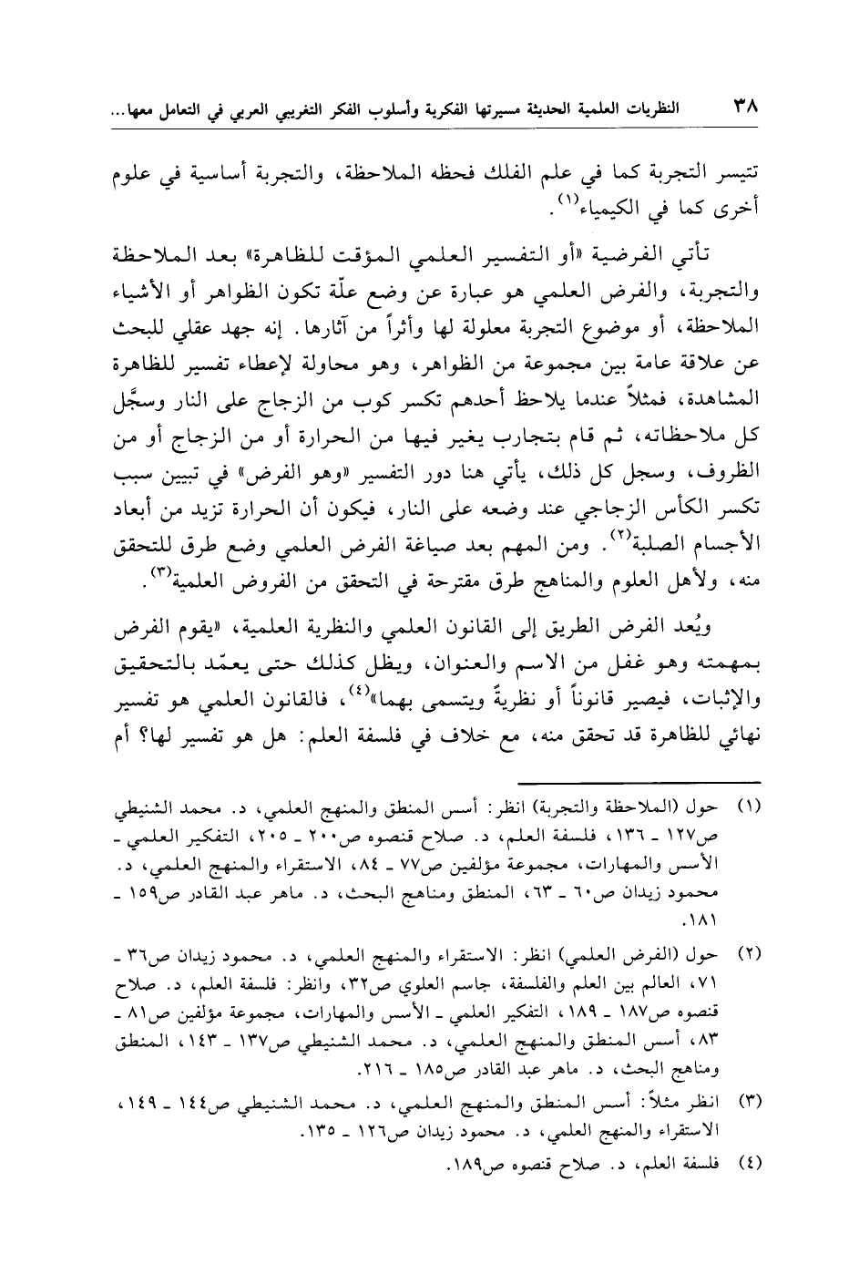 (¬2) حول (الفرض العلمي) انظر: الاستقراء والمنهج العلمي، د. محمود زيدان ص 36 - 71، العالم بين العلم والفلسفة، جاسم العلوي ص 32، وانظر: فلسفة العلم، د. صلاح قنصوه ص 187 - 189، التفكير العلمي -الأسس والمهارات، مجموعة مؤلفين ص 81 - 83، أسس المنطق والمنهج العلمي، د. محمَّد الشنيطي ص 137 - 143، المنطق ومناهج البحث، د. ماهر عبد القادر ص 185 - 216.